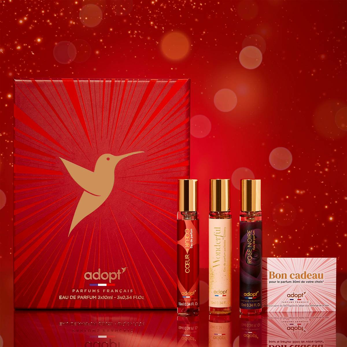 Contenance : 3 flacons de 10 ml chacun. Marque : Adopt. Coffret composé de trois eaux de parfum aux notes variées, présentées dans un packaging soigné et compact.