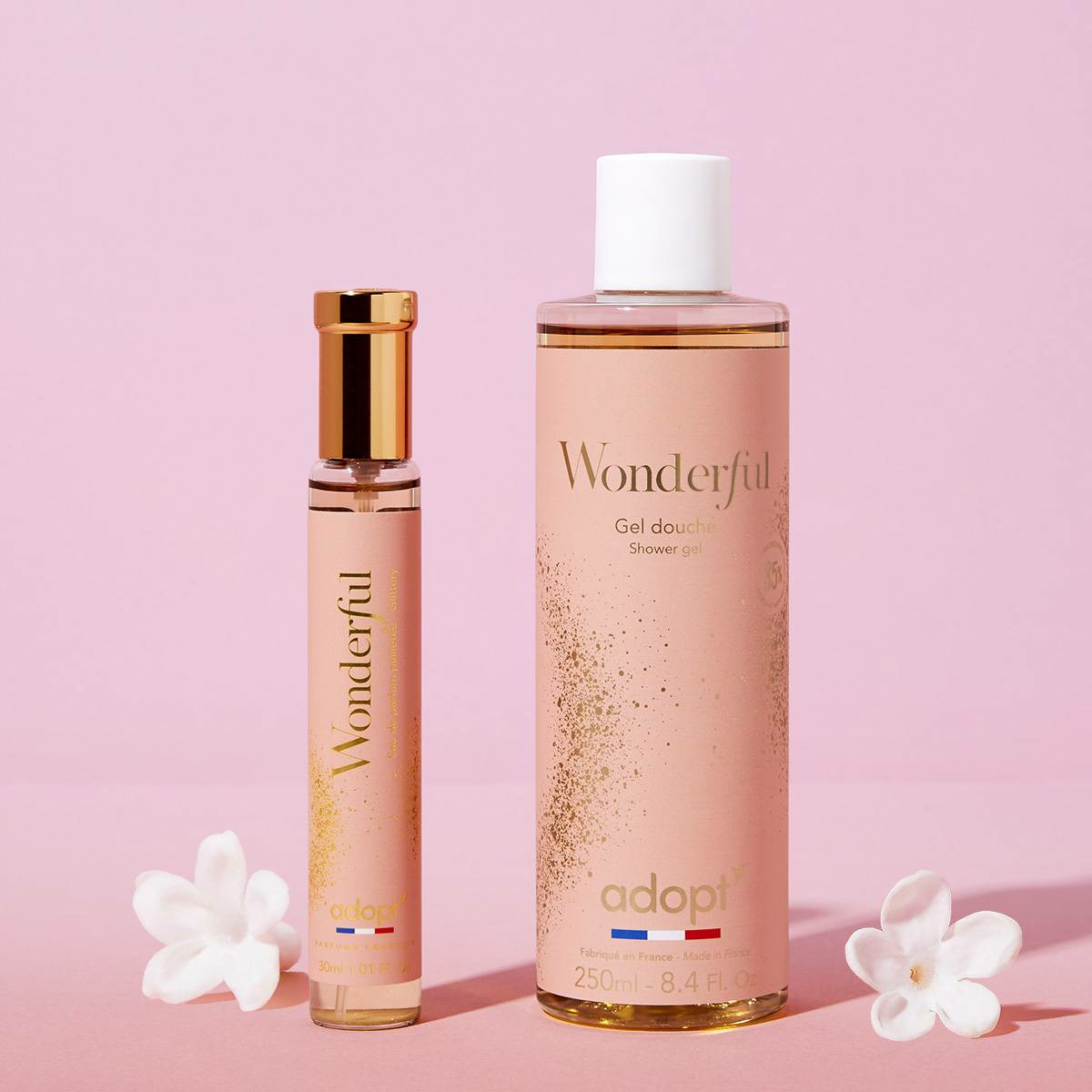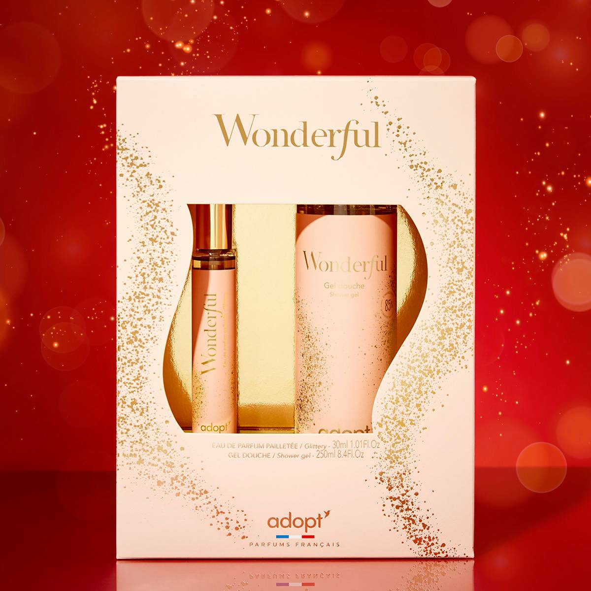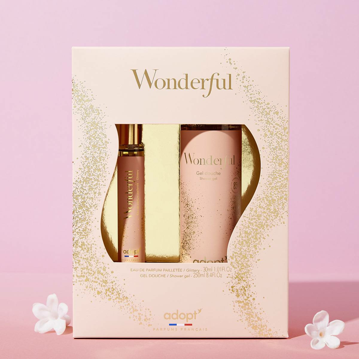 Le coffret comprend un flacon de parfum de 30 ml et un gel douche de 250 ml, tous deux élaborés par la marque Adopt, reconnue pour ses compositions de qualité et ses formules respectueuses de la peau.