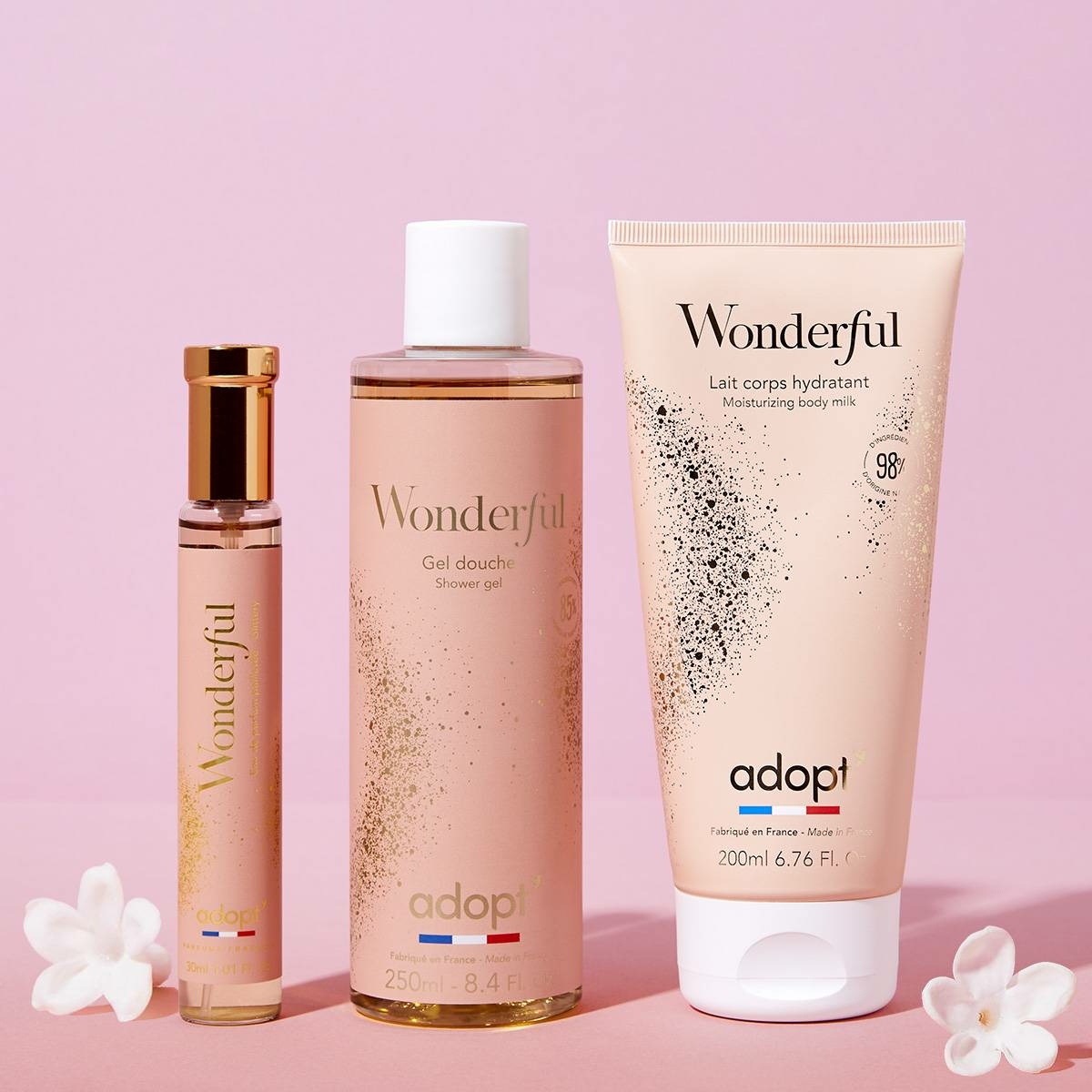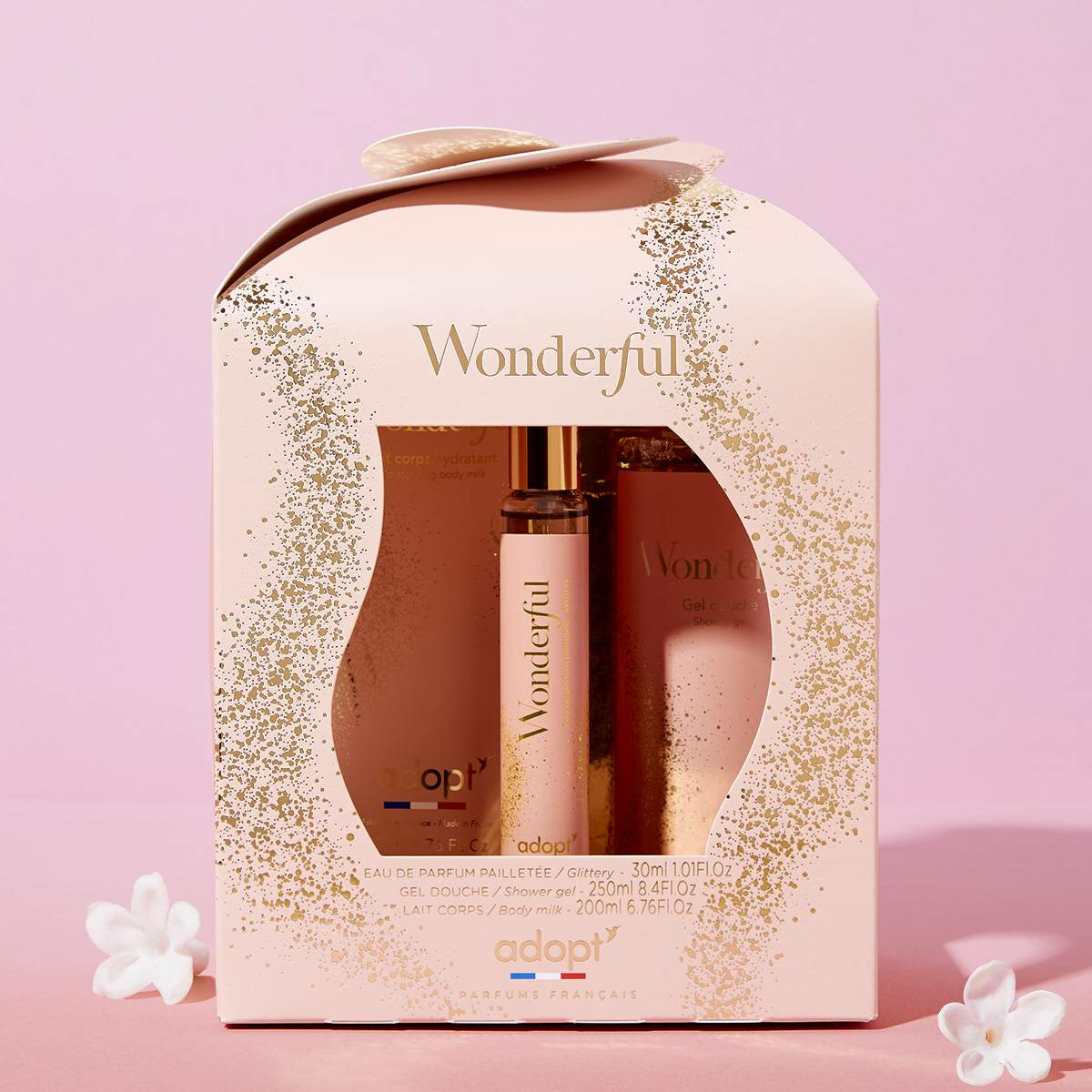 Le coffret comprend : un parfum 30 ml, un gel douche 250 ml et un lait corporel. Tous les produits sont signés Adopt, garantissant qualité et efficacité. Les formules sont adaptées à un usage quotidien et conviennent à tous types de peau.