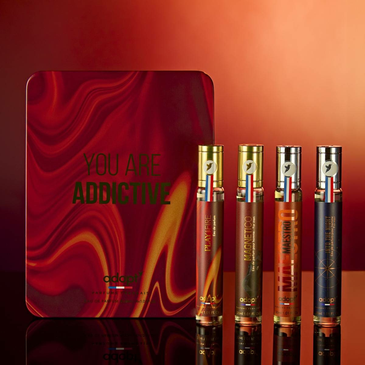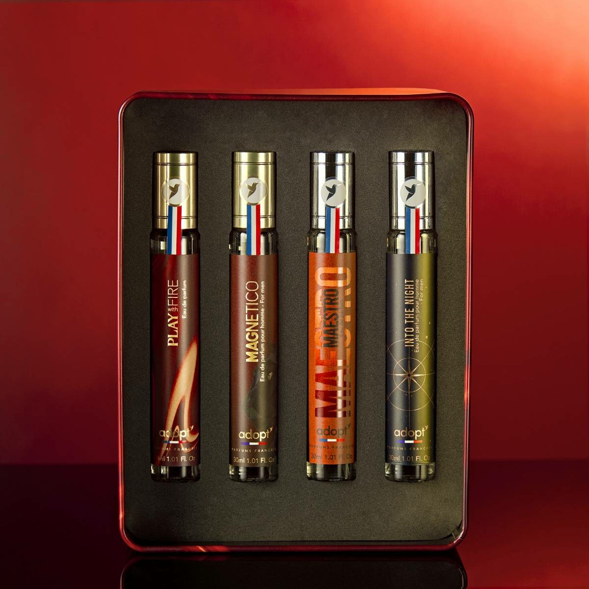 Contient 4 eaux de parfums Play with fire, présentées dans un coffret métallique résistant. Chaque flacon est soigneusement dosé pour une utilisation optimale. Marque : Adopt.