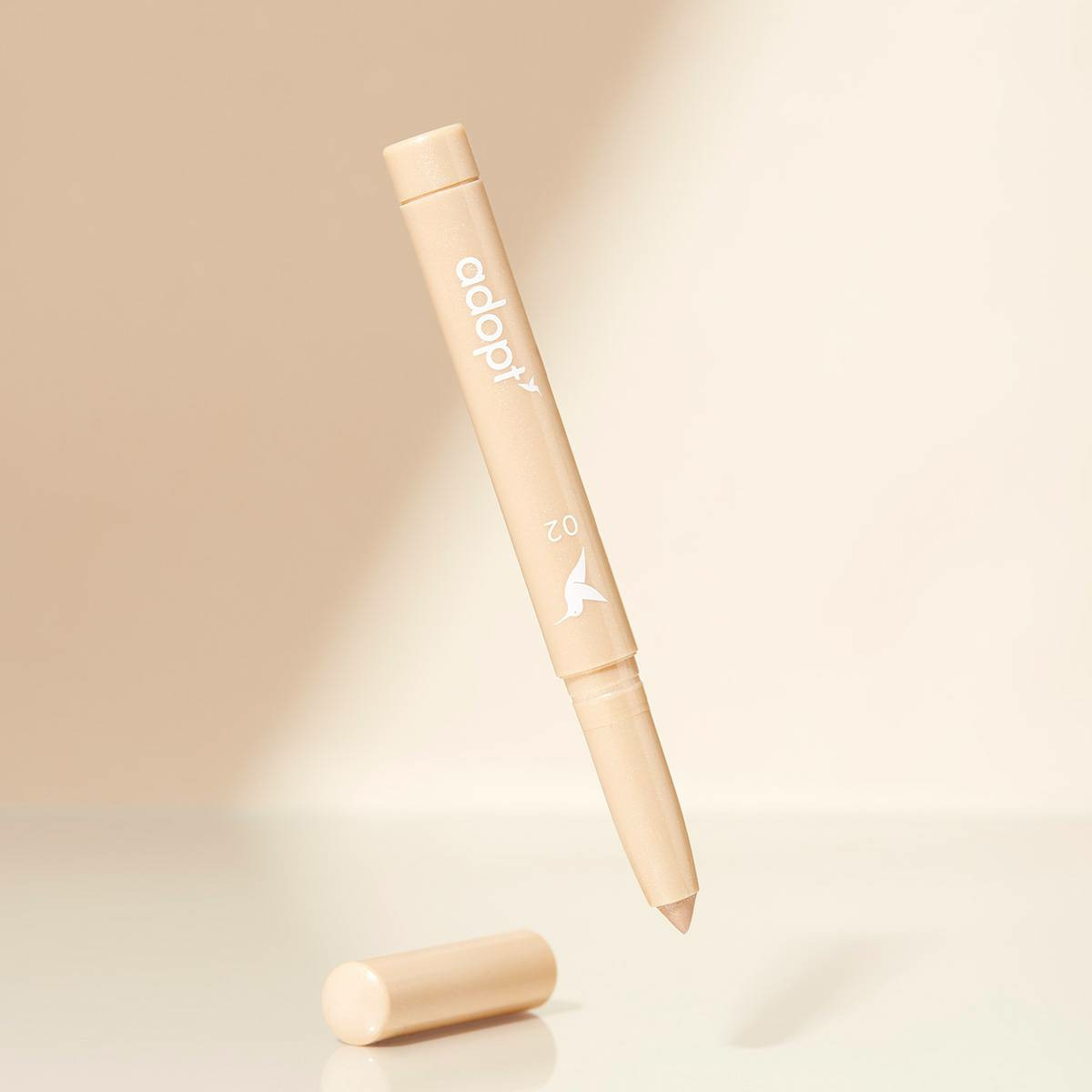 Format stick pratique, texture crémeuse waterproof, tenue jusqu’à 10 heures, facile à appliquer et estomper, marque Adopt.