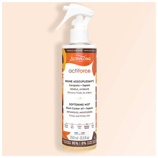 ACTIFORCE BRUME ASSOUPLISSANTE : Votre base capillaire déjà prête à l'usage ! Véritable base capillaire, la Brume Assouplissante hydrate, démêle et assouplit les cheveux sans les alourdir, permettant ainsi un coiffage facile. Enrichie en ingrédients nourrissants et hydratants, cette brume légère pénètre rapidement dans la fibre capillaire, procurant une douceur instantanée et une souplesse remarquable. Elle est idéale pour une utilisation quotidienne, offrant une solution rapide et efficace pour des cheveux toujours bien entretenus. Avec la Brume Assouplissante, dites adieu aux nœuds et aux cheveux difficiles à coiffer, et profitez d'une chevelure saine, brillante et parfaitement maniable jour après jour.