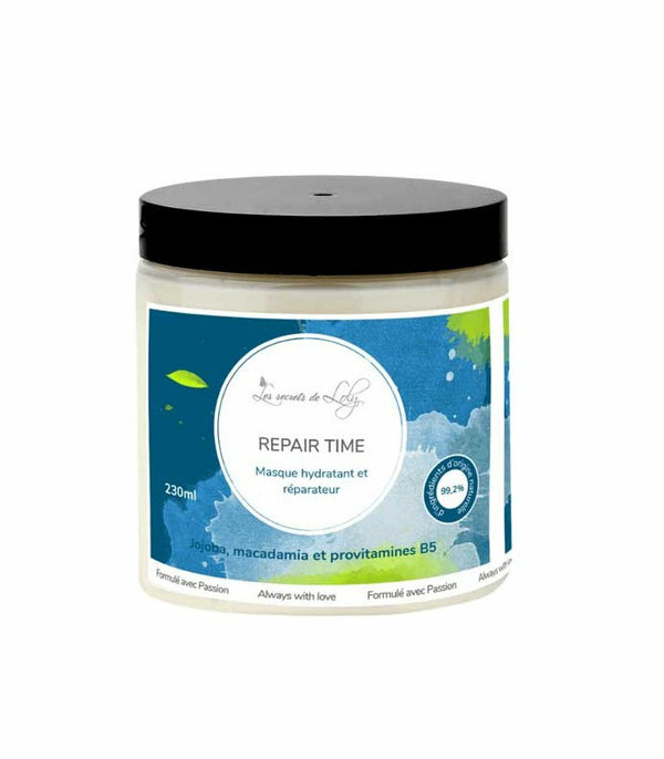 Le Masque crème hydratant Repair Time est élaboré à base d'aloe vera, de macadamia, de jojoba, de glycérine, de provitamine B5 et des huiles essentielles de bois de rose et de pamplemousse. Ce masque contient un actif cosmétique fortifiant : la provitamine B5. Elle rend le cheveu plus fort et plus brillant. C'est l'actif idéal pour les cuirs chevelus sensibles et sujets aux démangeaisons. Adapté à tous les types de cheveux, il ravira les personnes aux cheveux difficiles à démêler, fourchus et secs. Il rend les cheveux doux, soyeux, sans les étouffer. L'huile essentielle de pamplemousse est photosensibilisante.