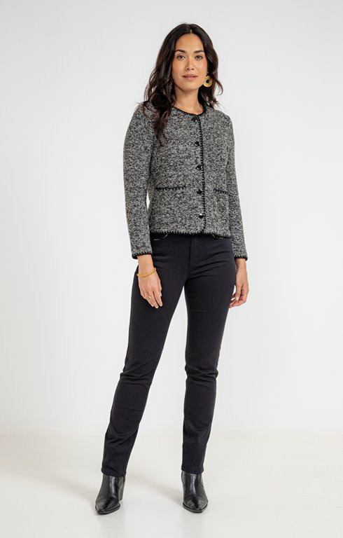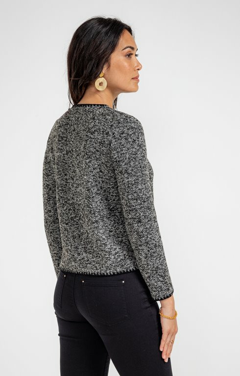Réponse. Ce cardigan est conçu en maille douce, offrant confort et légèreté.