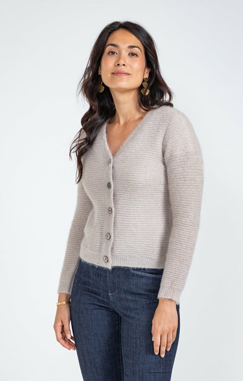 Réponse. Ce cardigan est confectionné en maille fluffy, offrant douceur et légèreté.