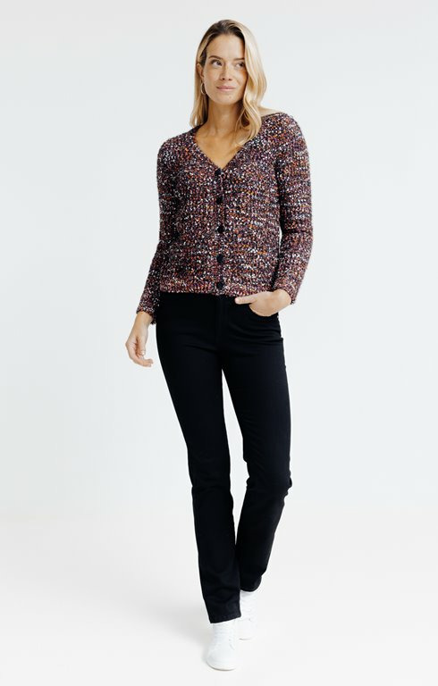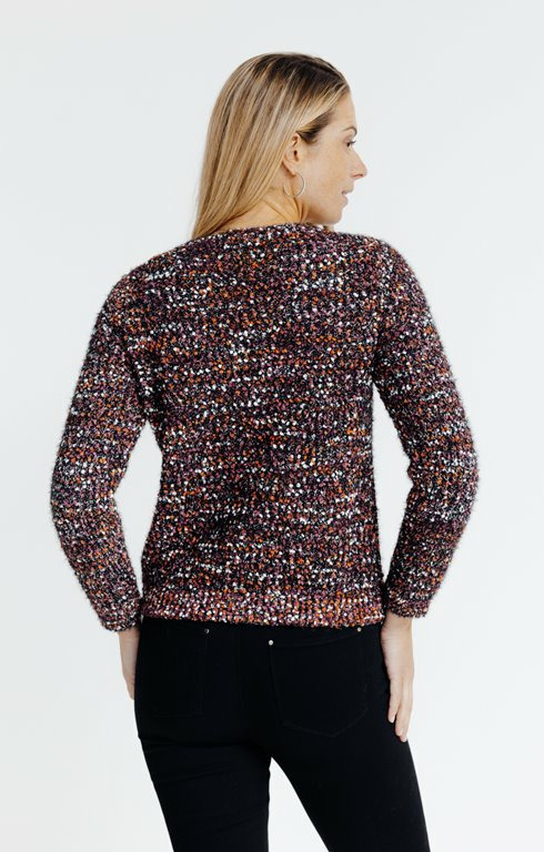 Réponse : Le cardigan est confectionné en maille popcorn, une texture en relief qui apporte confort et originalité.