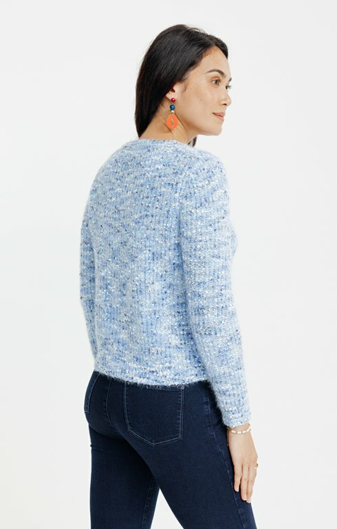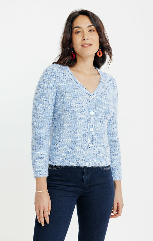 Réponse : Le cardigan est confectionné en maille popcorn, une texture en relief qui apporte confort et originalité.