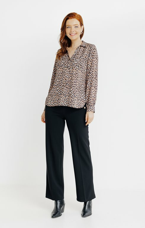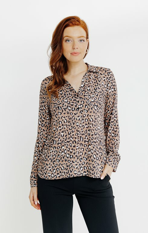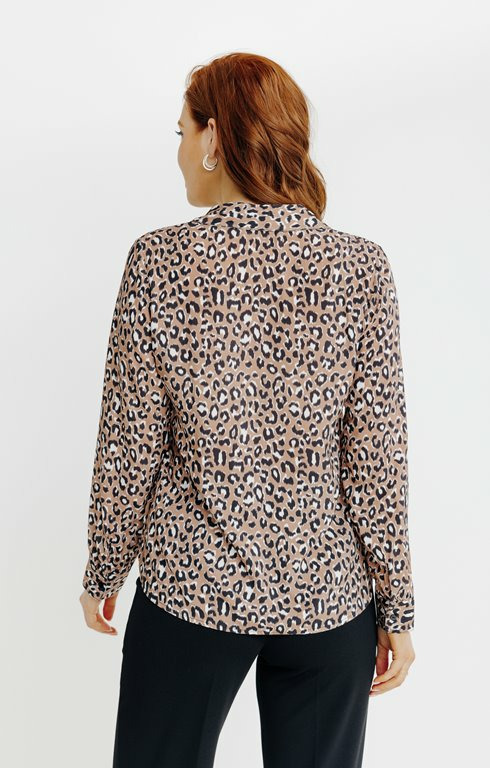 Chemise imprimé animalier 100 % polyester, coupe droite, manches longues avec poignets boutonnés, col classique. Lavable en machine à 30 degrés, repassage facile.