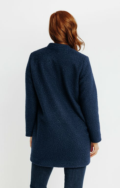Réponse. Le manteau est en matière bouclette, un tissu texturé et chaud, idéal pour l’hiver.