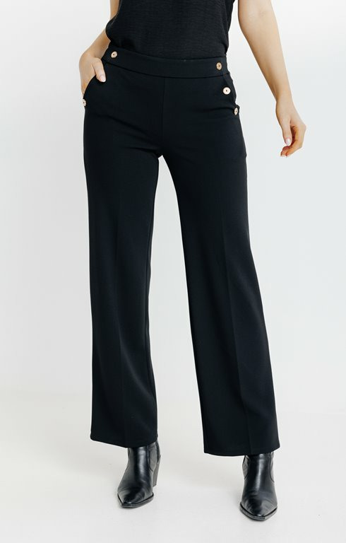 Fabriqué dans une maille de qualité, ce pantalon présente une coupe large et un détail bouton doré sur la taille. Disponible dans plusieurs tailles, il s’adapte à toutes les morphologies.