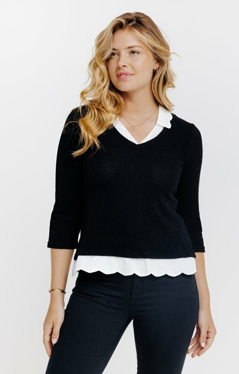 Confectionné dans une matière douce et agréable au toucher, ce pull se distingue par ses finitions festonnées qui apportent une touche féminine et originale à votre tenue. Sa coupe ajustée valorise la silhouette tout en offrant un confort optimal, idéal pour vos journées au bureau ou vos sorties décontractées.