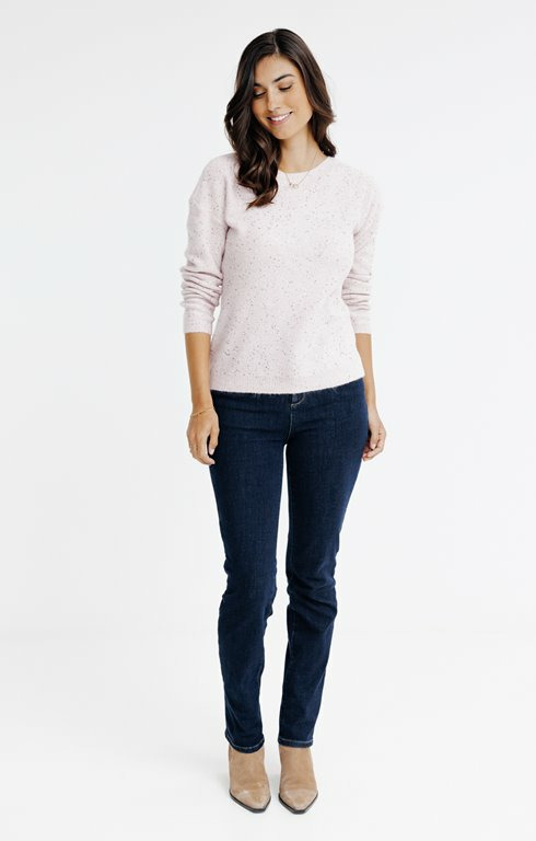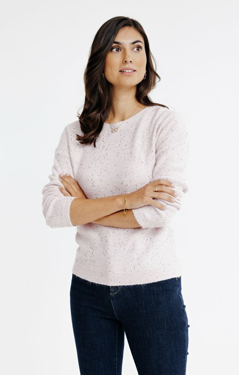 Ce pull uni se distingue par son jeu subtil de paillettes qui capte la lumière sans en faire trop. Sa coupe moderne et ajustée épouse la silhouette avec finesse, offrant un équilibre parfait entre confort et style. Facile à associer, il apporte une touche de sophistication discrète à vos looks quotidiens ou de soirée.