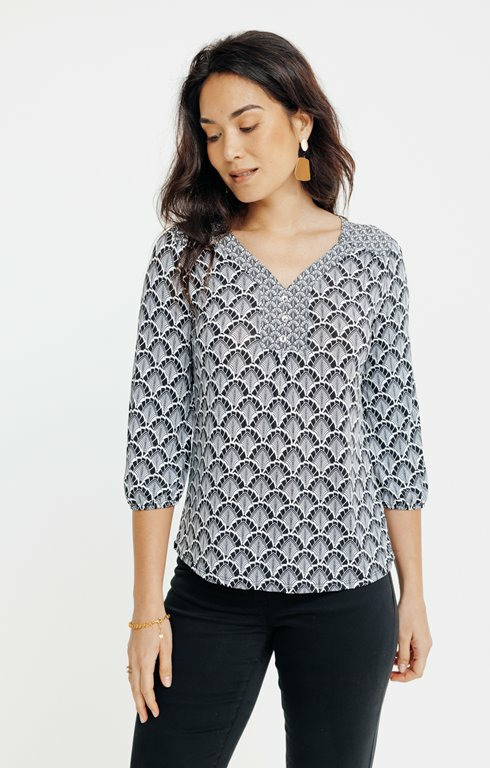 Fabriqué dans un tissu de qualité supérieure, ce T-Shirt présente un col en V classique, des manches trois quarts et une finition soignée aux coutures. Disponible dans plusieurs tailles, il répond aux exigences d’un dressing moderne et fonctionnel.