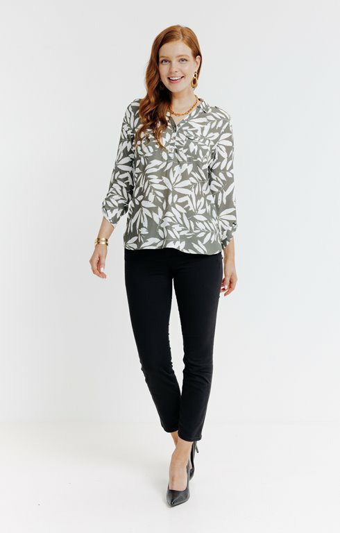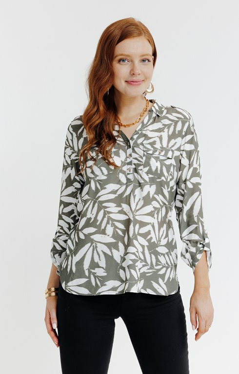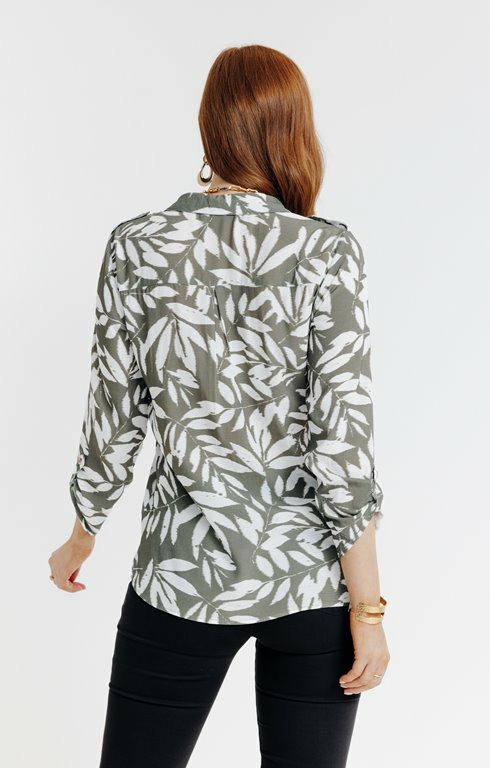 Fabriquée dans un tissu léger et respirant, cette tunique présente un col chemise classique, une fermeture boutonnée discrète et des manches longues ajustables. Son imprimé feuillage est réalisé avec des encres de qualité pour garantir tenue et éclat au fil du temps.