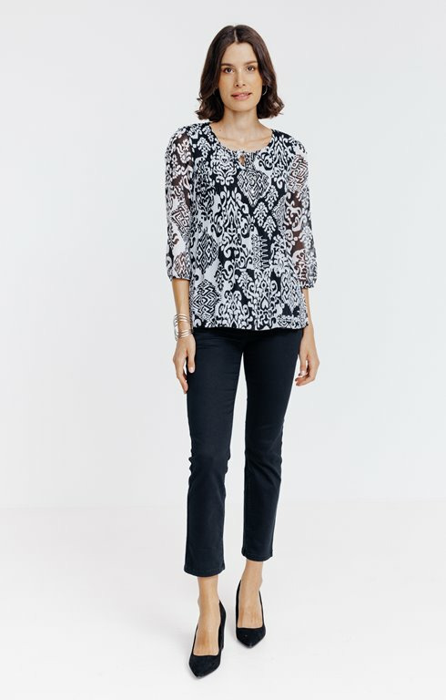 Conçue pour valoriser votre allure tout en garantissant un port agréable, cette tunique vous accompagne du bureau à vos sorties. Son tissu plissé masque élégamment les petites imperfections et son imprimé original dynamise votre garde-robe, faisant de chaque journée une occasion de vous démarquer.