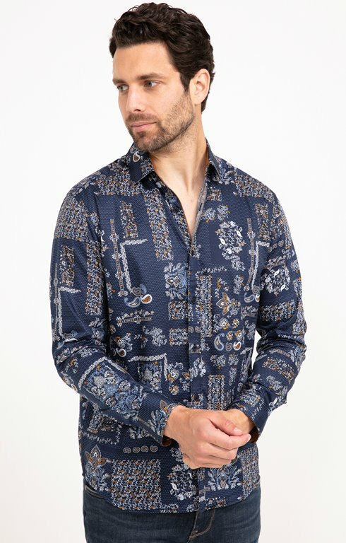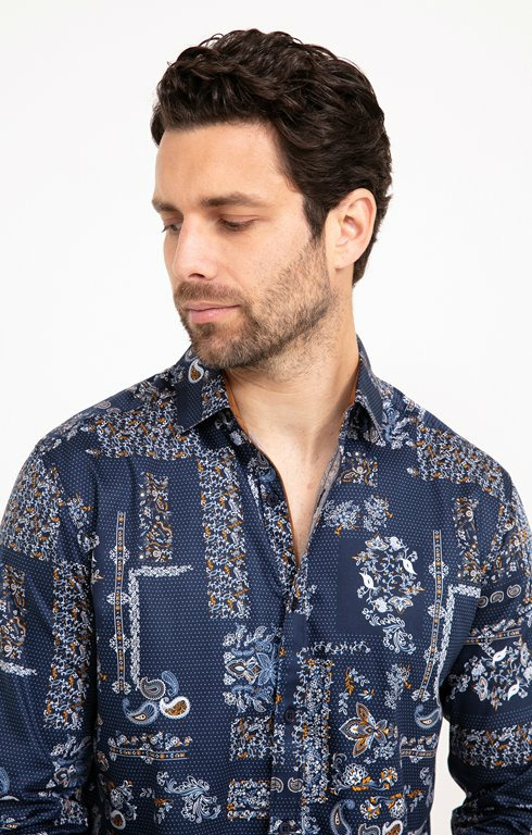"Chemise droite à manches longues en coton biologique avec imprimé pois et patchwork. Coupe droite regular. Manches longues droites à poignets boutonnés. Col souple. Ouverture centrale boutonnée. Imprimé multicolore, patchwork de motifs cachemire, guirlandes végétales, fleurs et pois sur l’ensemble. Matière souple et confortable. Col et poignets à revers contrastants.Notre mannequin Joffrey mesure 1m88 et porte une chemise taille M."
