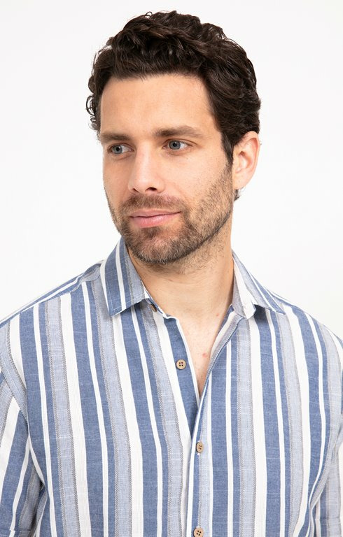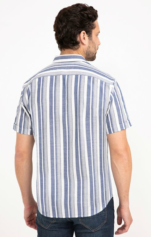 Chemise boutonnée à rayures à manches courtes et col souple. Coupe droite. Manches courtes à revers cousus. Col chemise souple. Fermeture boutonnée. Imprimé rayures. Tissu léger aspect fil-à-fil. Empiècement de renfort en haut du dos. Fines surpiqûres discrètes en finition du modèle. Petits boutons aspect bois. Base arrondie. Composition contenant du coton.Notre mannequin Joffrey mesure 1m88 et porte une chemise taille M.