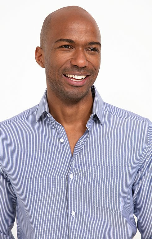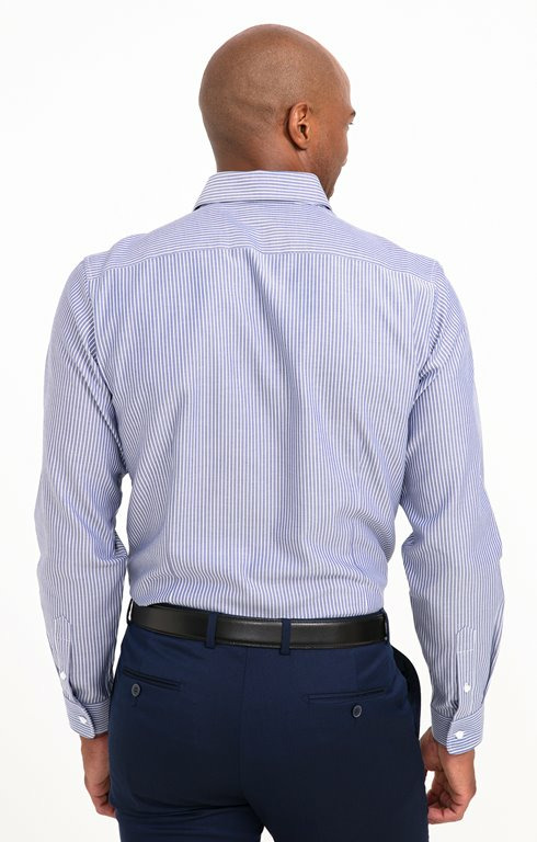 Fabriquée en coton de qualité, cette chemise présente un col classique, des manches longues avec poignets ajustables, et un motif rayé chevron qui apporte du relief sans excès. Sa coupe ajustée garantit une tenue impeccable, tandis que les finitions soignées témoignent du savoir-faire Armand Thierry.