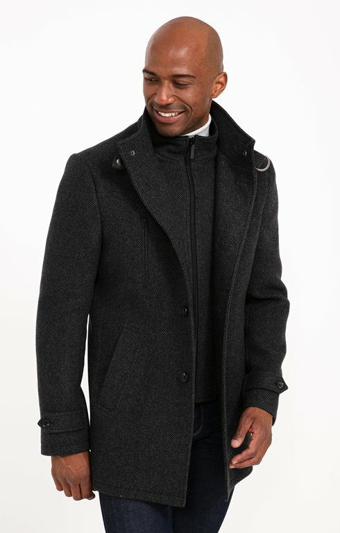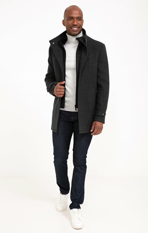 Manteau mi-long à double col avec effet gilet intérieur. Coupe ajustée. Manches longues avec pattes boutonnées aux poignets. Double col montant. Fermeture zippée et boutonnée. Fermeture à patte à boucle métallique et pression au col. 2 poches poitrine zippées, 2 poches passepoilées à la taille, 2 poches intérieures à double passepoil. Coloris chiné. Matière doublée. Effet gilet intérieur amovible par zip.Notre mannequin Marvin mesure 1m87 et porte un manteau taille M.