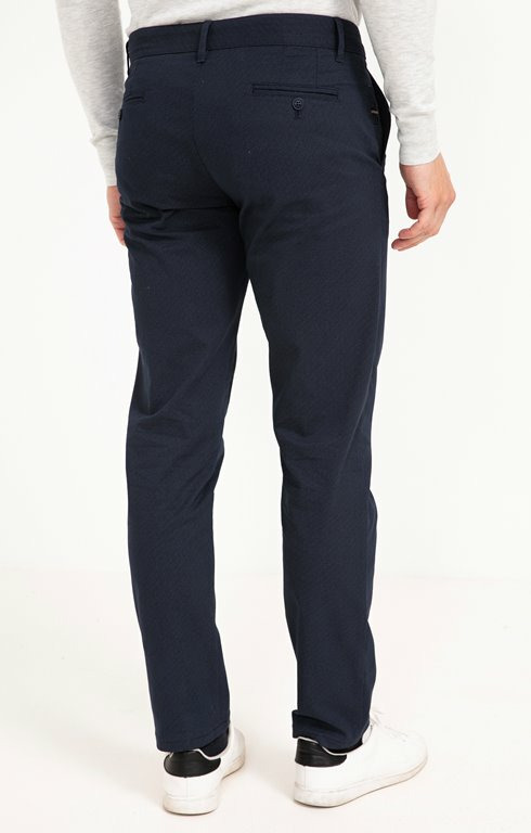"Pantalon en coton stretch imprimé graphique à 5 poches. Coupe ajustée. Fermeture à zip sous bord et boutonnée. 2 poches italiennes et une poche ticket passepoilée verticale devant. 2 poches passepoilées à bouton au dos. Micro motifs géométriques donnant effet faux-uni. Matière extensible. Détail galon bicolore sur la poche ticket. Boutons avec marque gravée. Composition en coton majoritaire.Notre mannequin Joffrey mesure 1m88 et porte un pantalon taille 42."