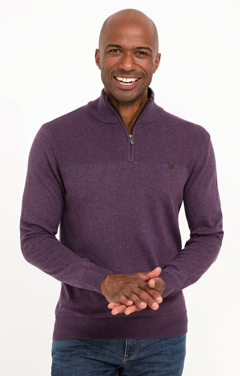 Laissez-vous séduire par ce modèle intemporel, disponible dans différents coloris. Pull uni à col camionneur. Coupe droite. Manches longues. Col montant. Fermeture par un zip au col. Maille chiné. Maille fantaisie dans la partie supérieure devant. Finitions bords-côtes à la base, au col et aux poignets. Écusson sur la poitrine. Composition en coton et polyester recyclé.Notre mannequin Marvin mesure 1m87 et porte un pull taille M.