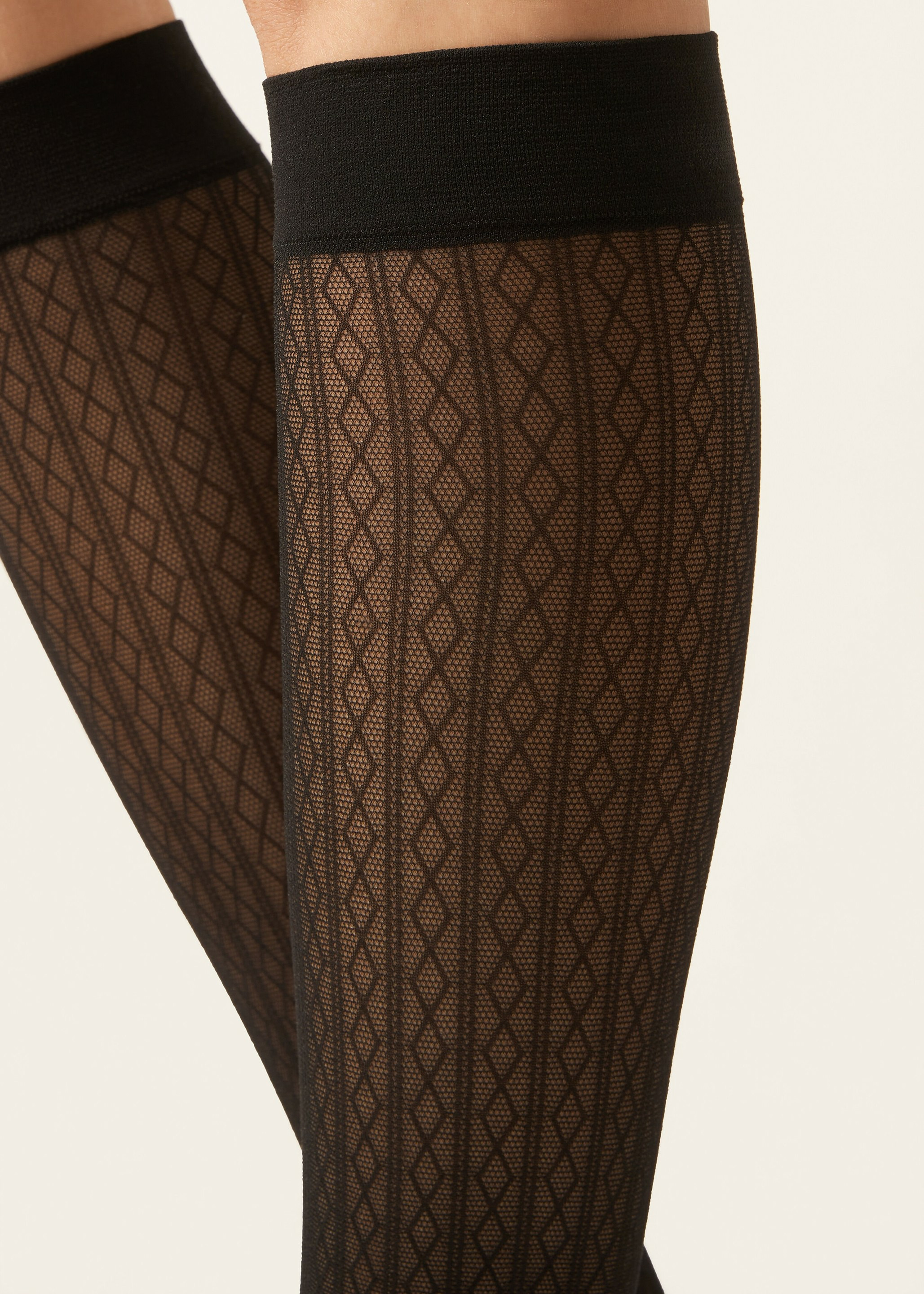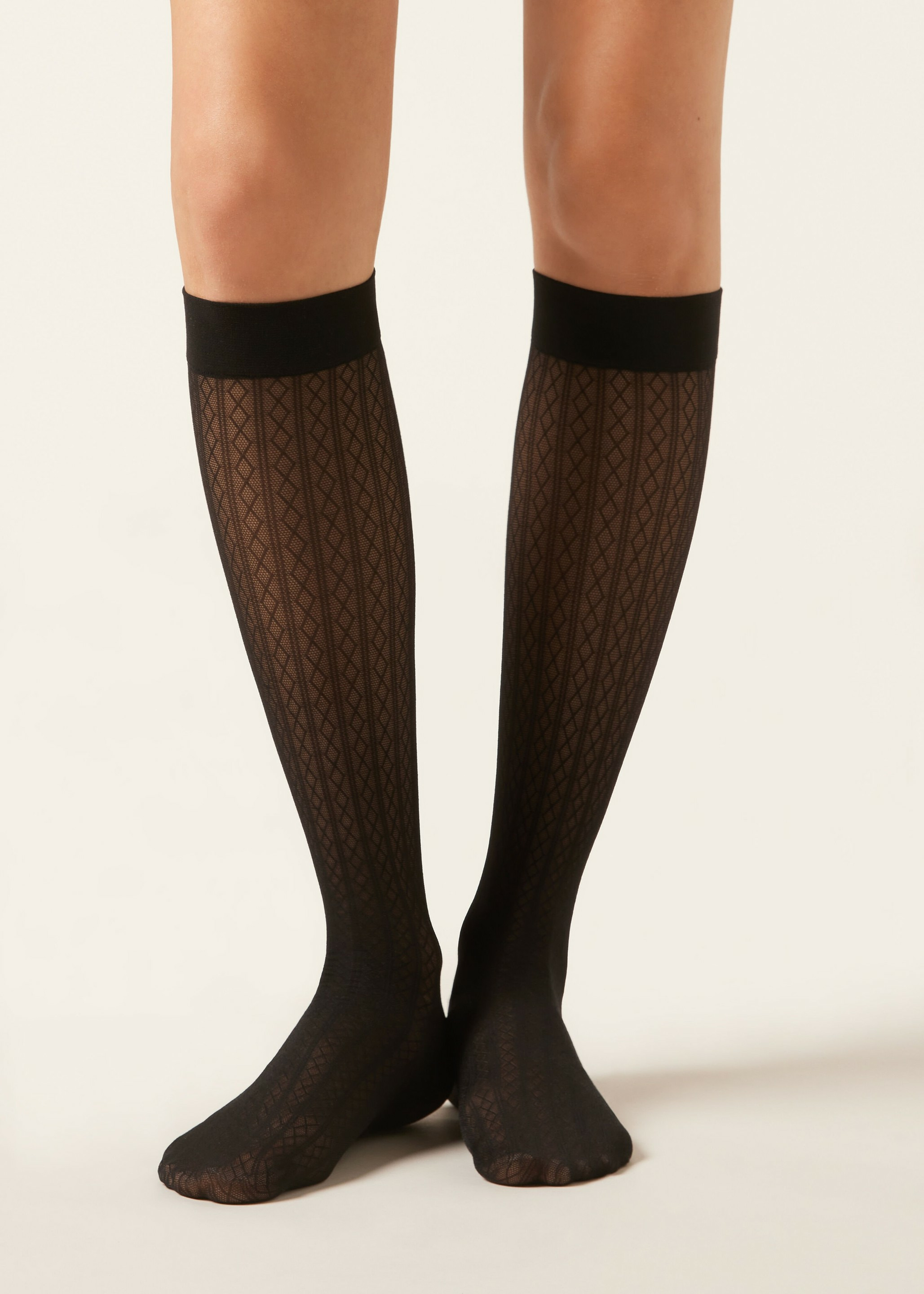 Chaussettes hautes pour femme à motifs de losanges verticaux et à ourlet doux et lisse. Élégantes, pratiques et parfaites pour toutes les occasions.