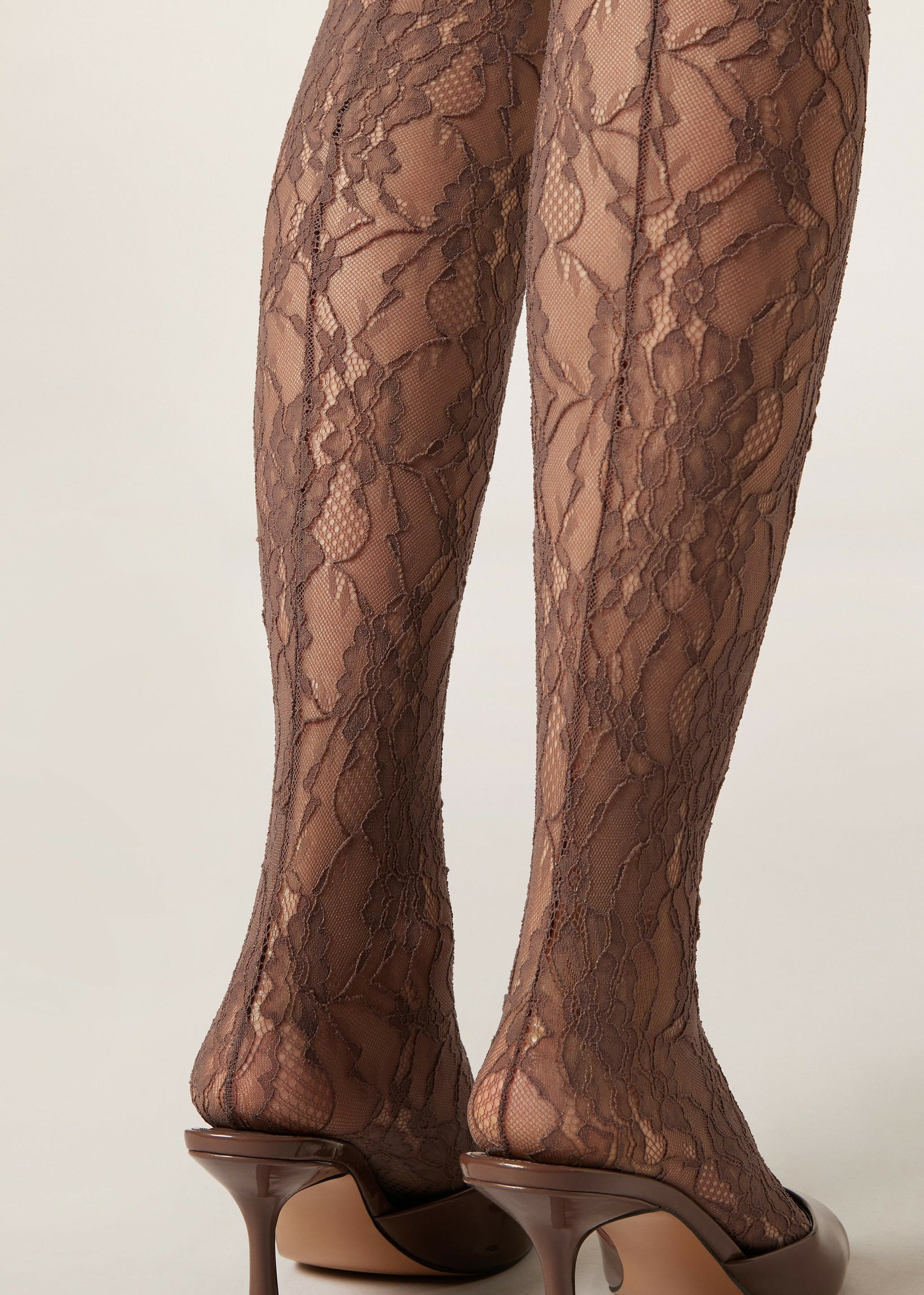 Collant raffiné et féminin en dentelle fleurie hautement élastique. Issu de la collection Deluxe Selection Capsule, il exprime la sophistication grâce à sa confection recherchée et ses détails soignés. Fabriqué en Italie, il présente une couture à l’arrière qui met en valeur son côté séduisant et sa coupe impeccable.
