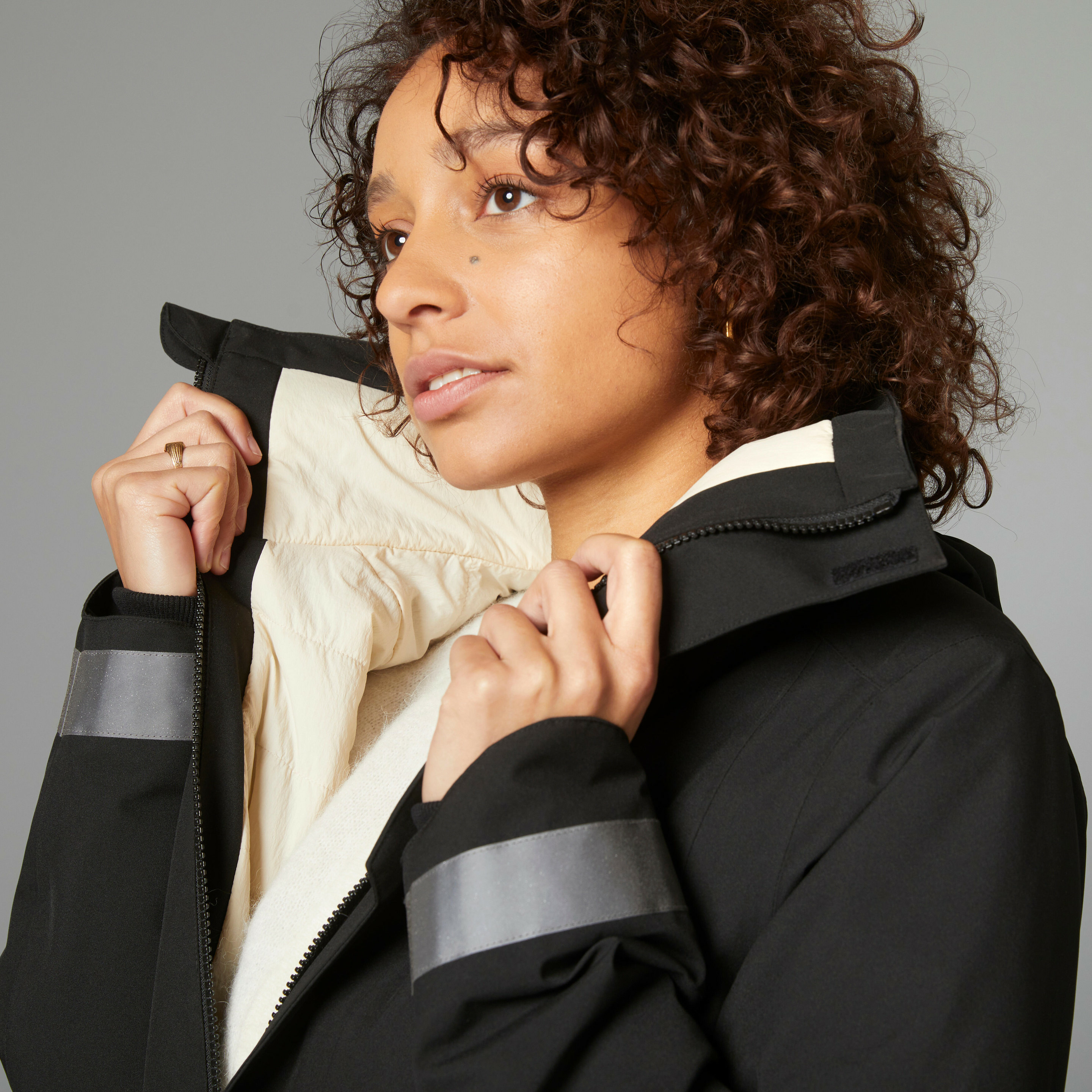 Tissu enduit déperlant, ouate isolante, zips de ventilation latéraux, coupe ajustée, éléments réfléchissants pour une meilleure visibilité nocturne.