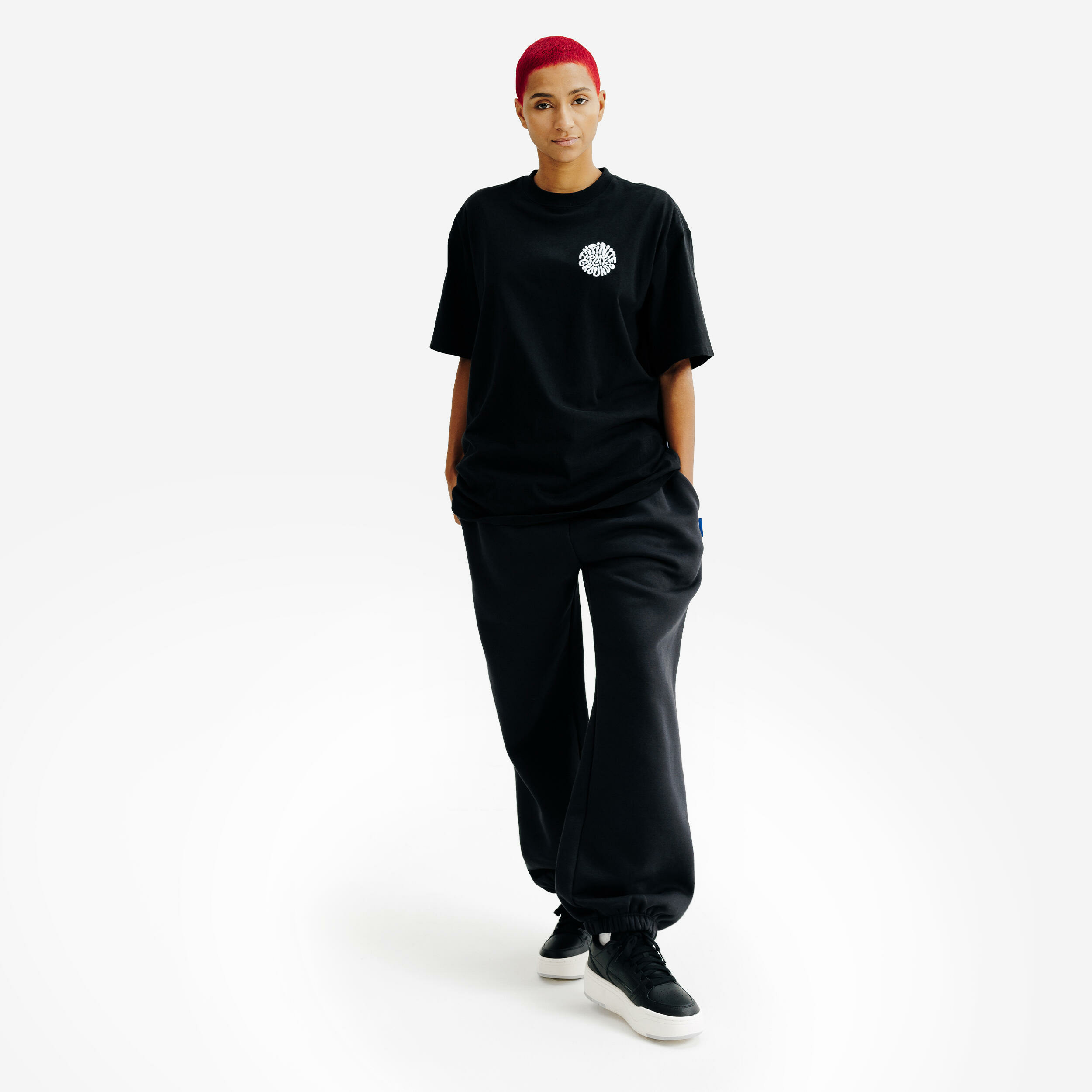 Coupe loose basique pour un porté décontracté. 100 % coton, facile d’entretien. Disponible en noir, taille mixte. Lavable en machine.