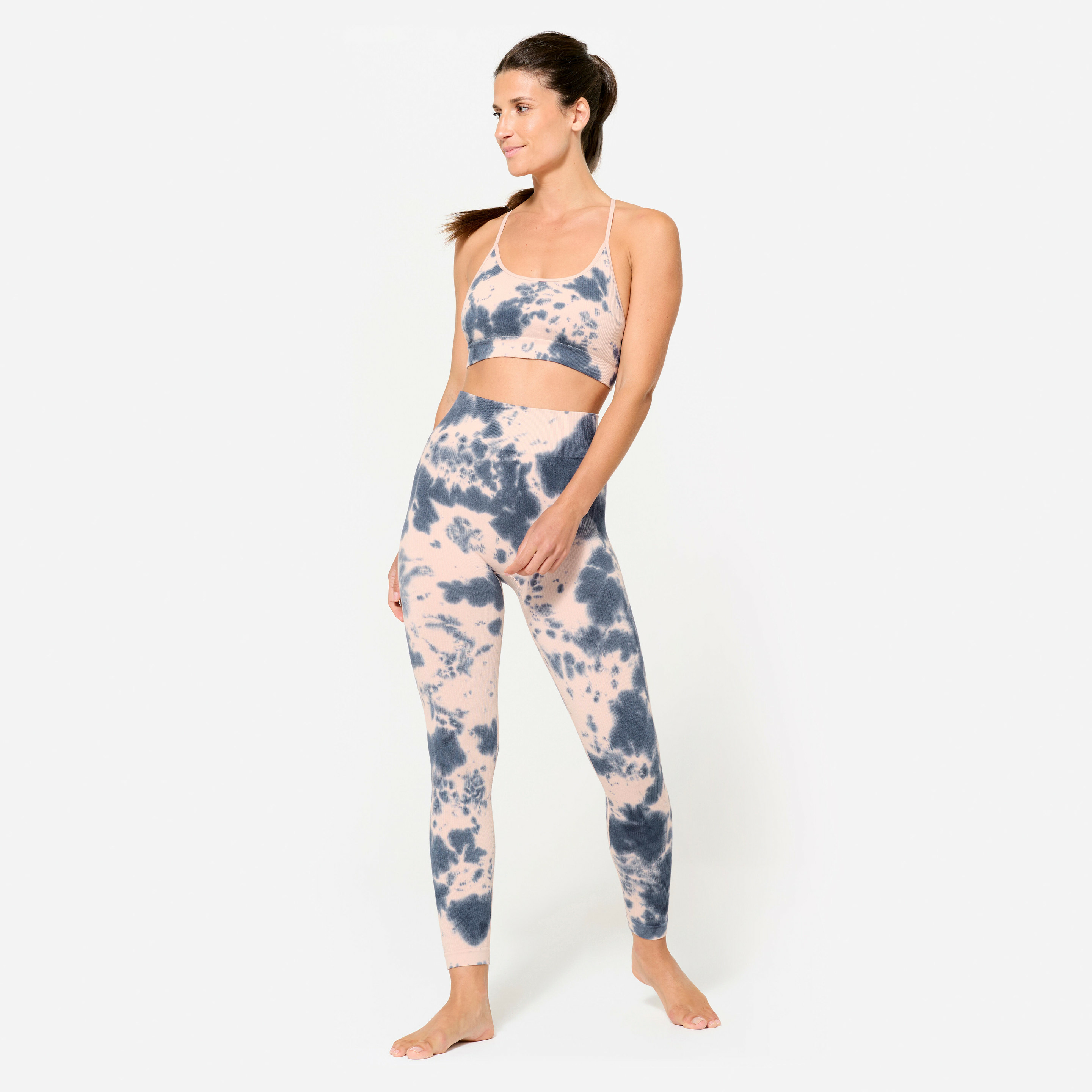 Adoptez la liberté de mouvement avec style grâce à cette brassière côtelée sans couture au motif rose et bleu. Un maintien léger pensé pour accompagner toutes vos activités en toute discrétion.