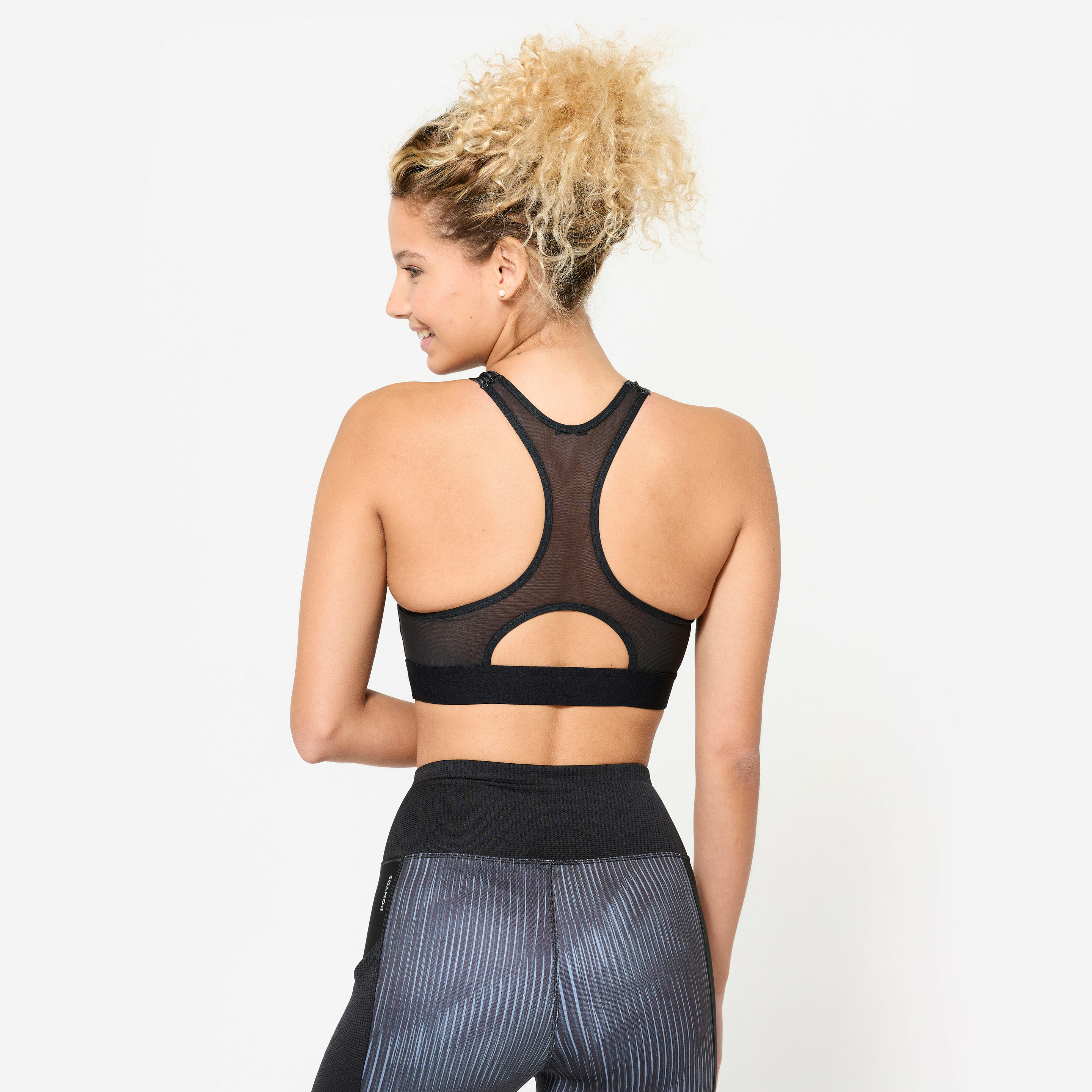 Brassière femme DOMYOS, imprimé noir et gris, dos nageur. Matière principale avec élasthanne pour élasticité et confort. Coques intégrées pour un maintien modéré. Tissu technique qui évacue la transpiration et sèche rapidement.