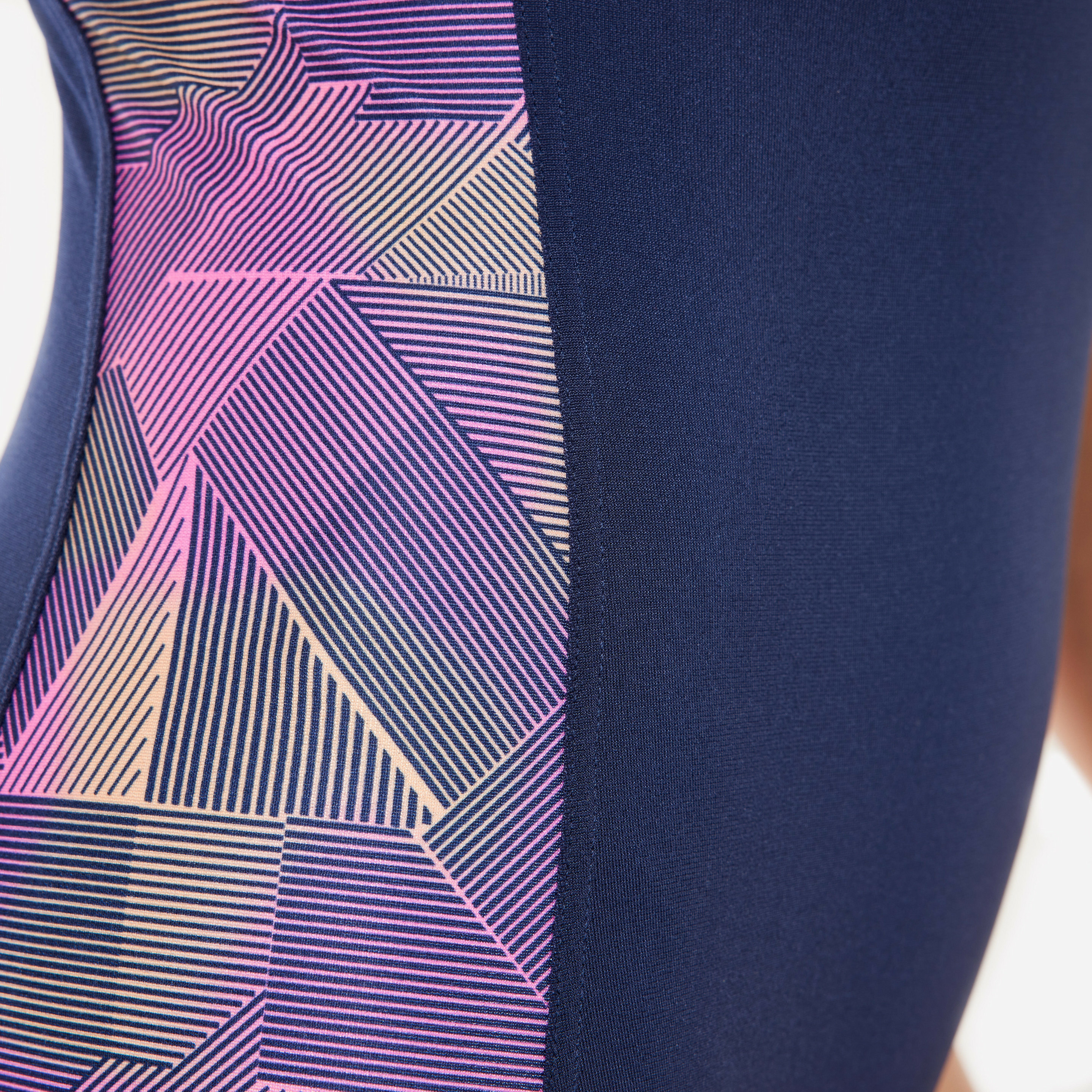 Ce maillot se distingue par ses bretelles larges et son dos montant en V, offrant un excellent maintien tout en garantissant une grande liberté de mouvement. Son échancrure basse apporte une touche féminine sans compromettre la couverture, idéal pour les nageuses régulières qui recherchent confort et durabilité. La combinaison de bleu et rose dynamise votre allure à chaque longueur.