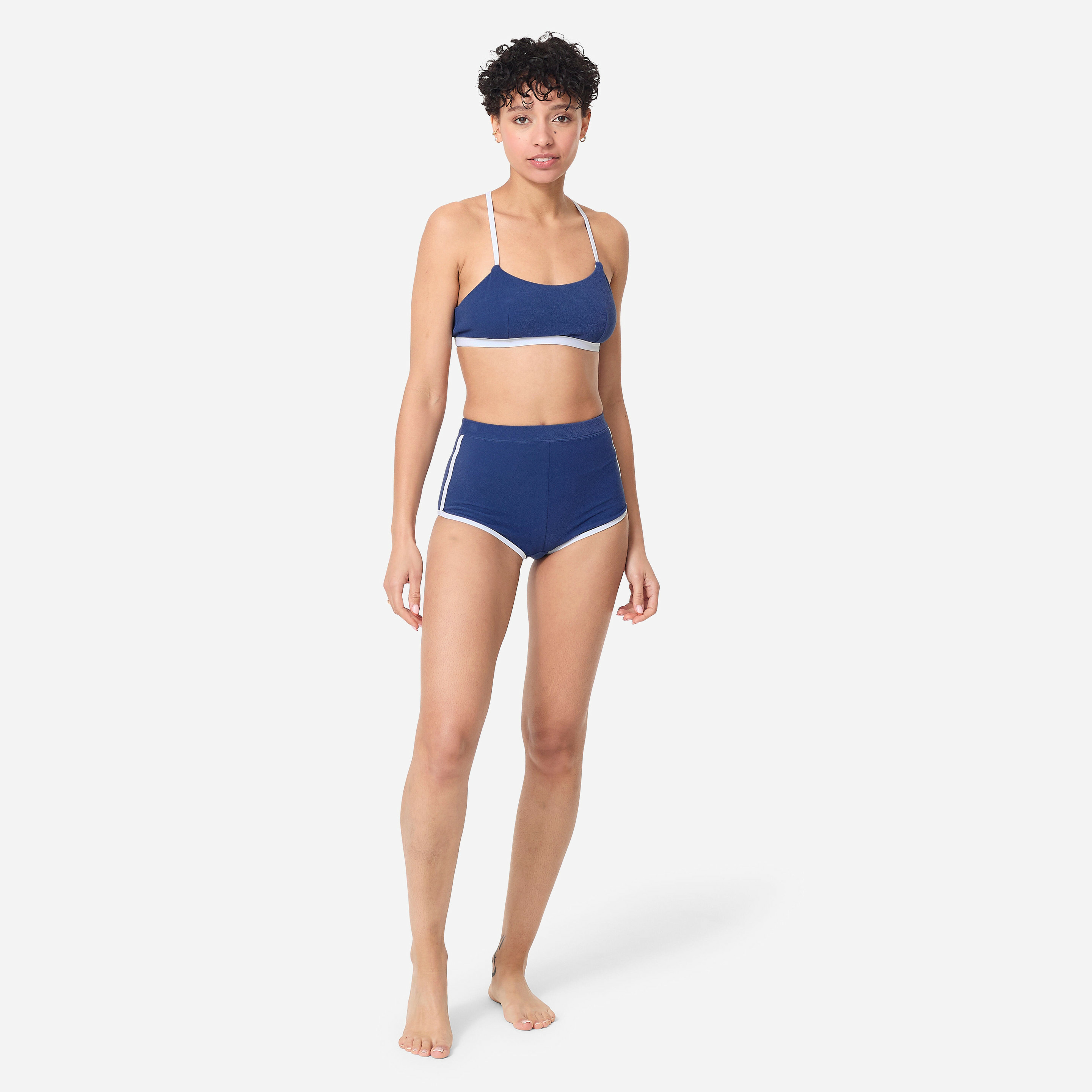 Fabriquée en tissu éponge, elle combine légèreté et résistance à l’eau salée. Les bretelles se retirent ou se réajustent facilement pour passer d’un style classique à un porté croisé ou sans bretelles, selon vos envies.