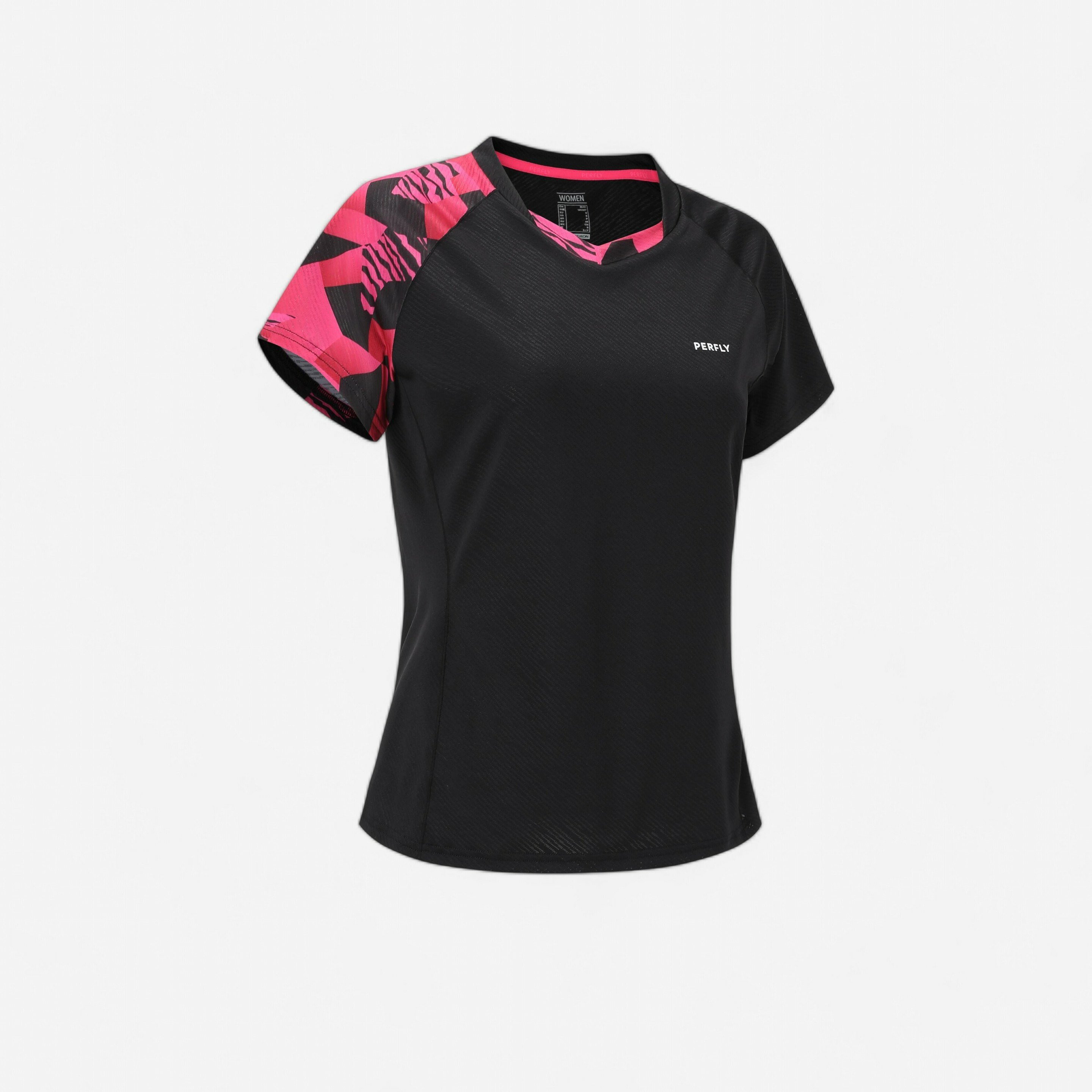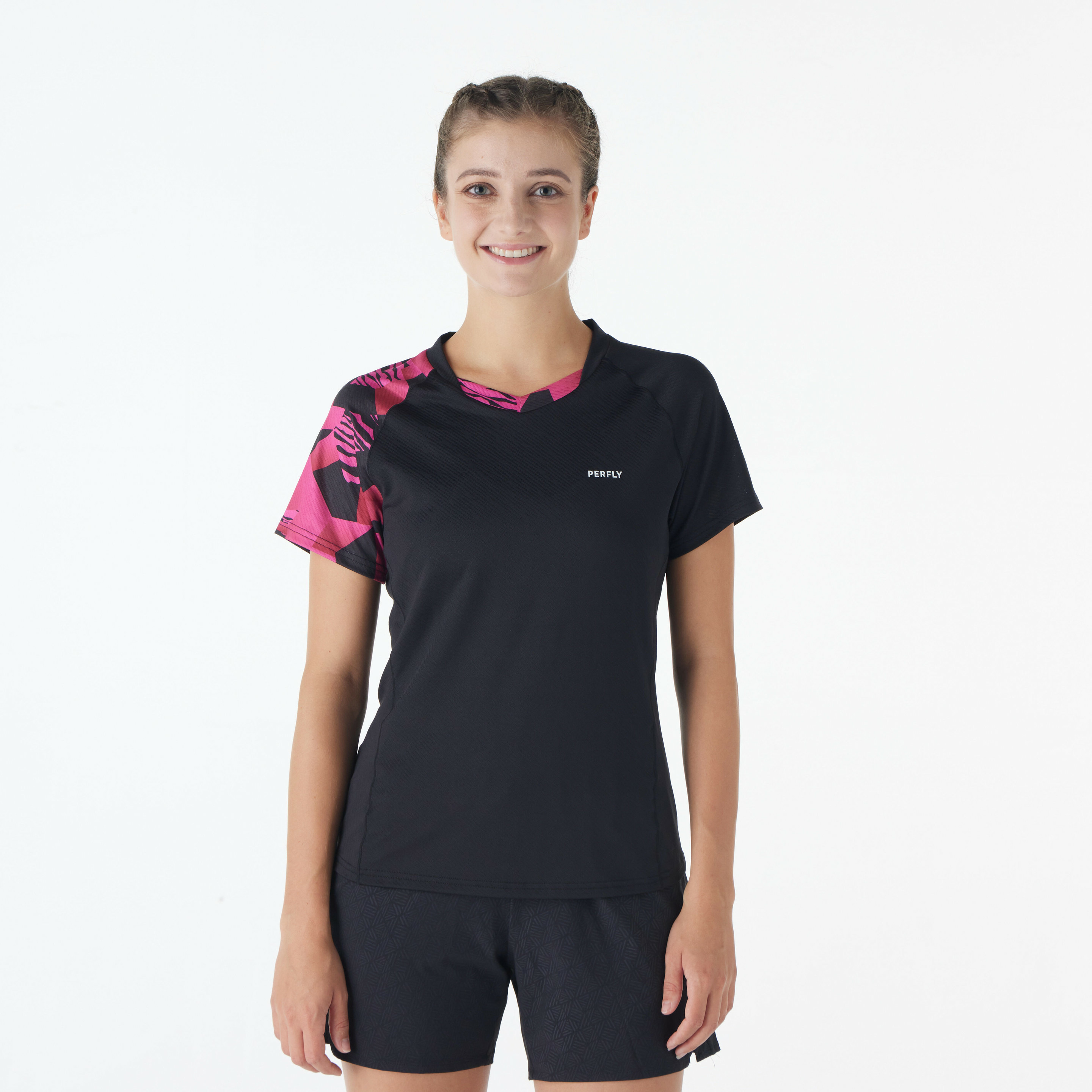 Les jeunes joueuses de badminton confirmées recherchant un t-shirt technique pour des entraînements et des matchs réguliers. Ce T-shirt est fabriqué en tissu synthétique extensible pour garantir une liberté de mouvement. La structure spéciale du tissu permet une gestion de l’humidité et une légèreté extraordinaires.