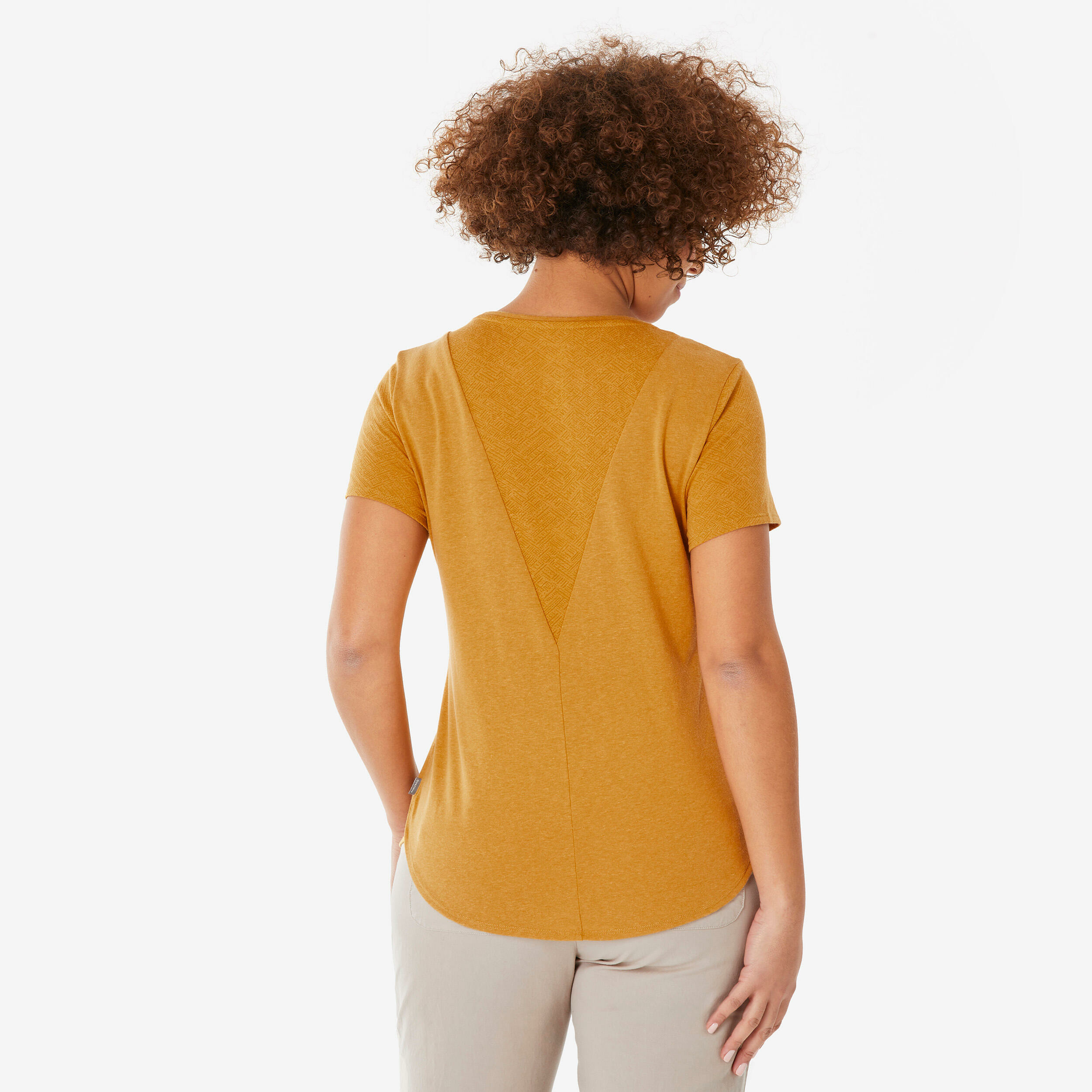 Découvrez le t-shirt de randonnée femme NH500 jaune ocre, conçu pour vous accompagner dans toutes vos aventures sous le soleil. Sa coupe ample et son coloris lumineux allient confort et style pour vos sorties en pleine nature.