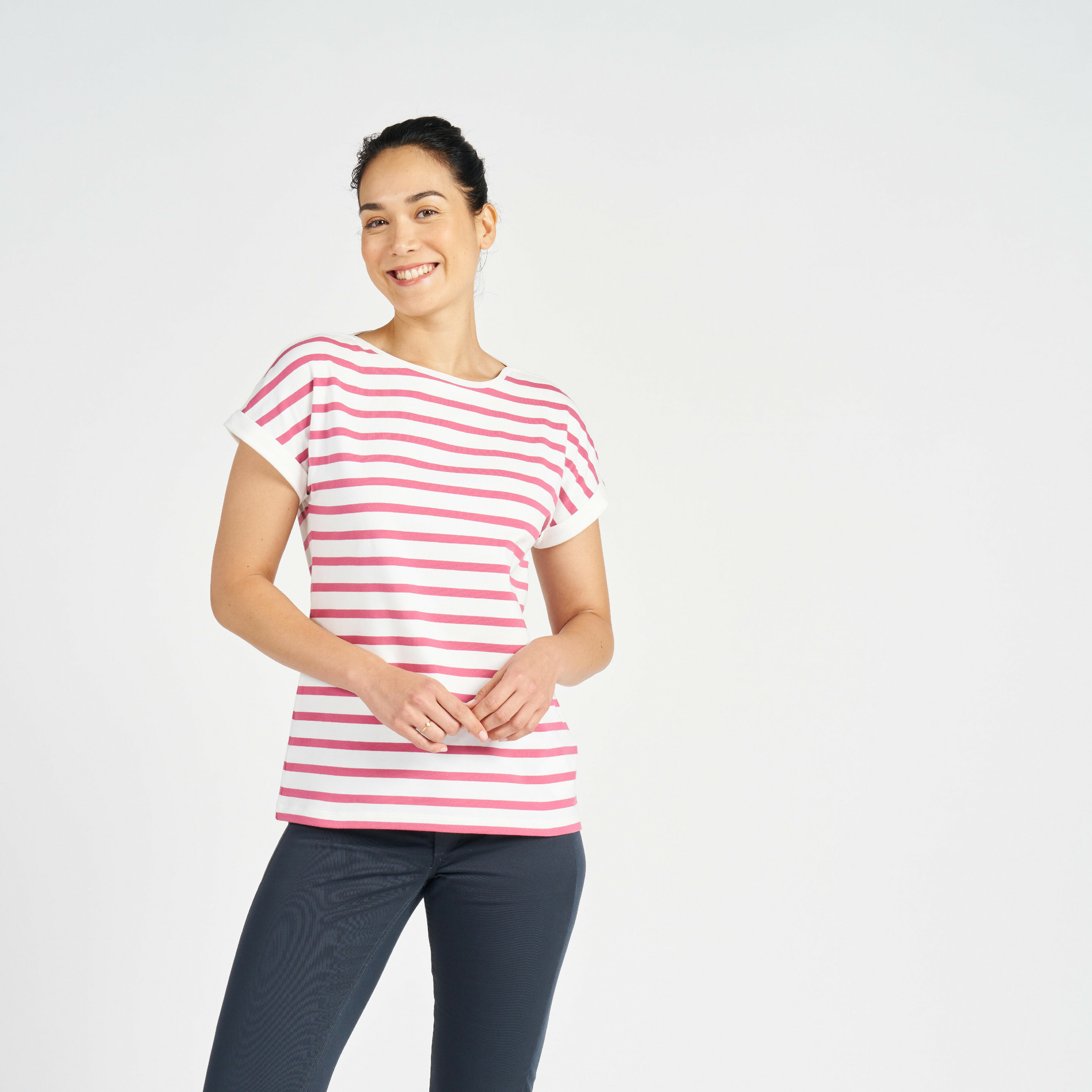 Adoptez l’élégance intemporelle de la marinière avec ce T-shirt manches courtes signé Tribord, pensé pour les femmes actives et stylées. Sa teinte écru associée à des rayures rose apporte une touche de fraîcheur à votre garde-robe estivale.