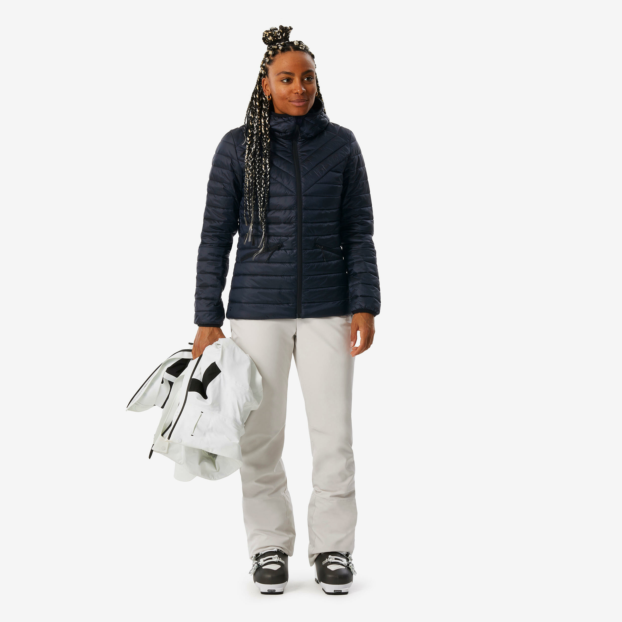 Cette doudoune est-elle adaptée à un usage quotidien en ville ? Oui, sa légèreté et son style discret la rendent parfaite pour un usage urbain en hiver. Peut-on la porter seule ou uniquement sous une veste de ski ? Elle est conçue pour être portée sous une veste de ski, mais peut aussi se porter seule lors de températures modérées. Comment entretenir cette doudoune ? Elle se lave en machine, ce qui facilite son entretien sans compromettre ses qualités thermiques. Est-elle résistante à la neige et à l’humidité ? Oui, son tissu déperlant garantit un maintien au sec même sous une neige fine. Cette doudoune convient-elle à tous les types de morphologies ? Sa coupe ajustée est pensée pour épouser la silhouette féminine tout en offrant une grande liberté de mouvement.