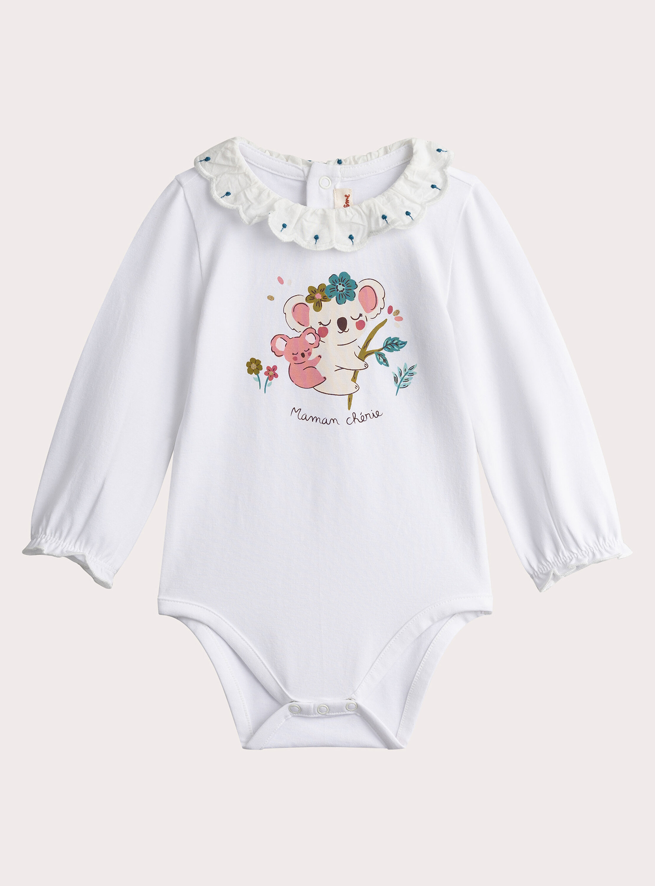 Body manches longues pour bébé fille, marque Du Pareil au Même. Matière principale : coton doux. Fermeture par pressions à l’entrejambe et sur l’épaule. Disponible en plusieurs tailles adaptées aux premiers mois.