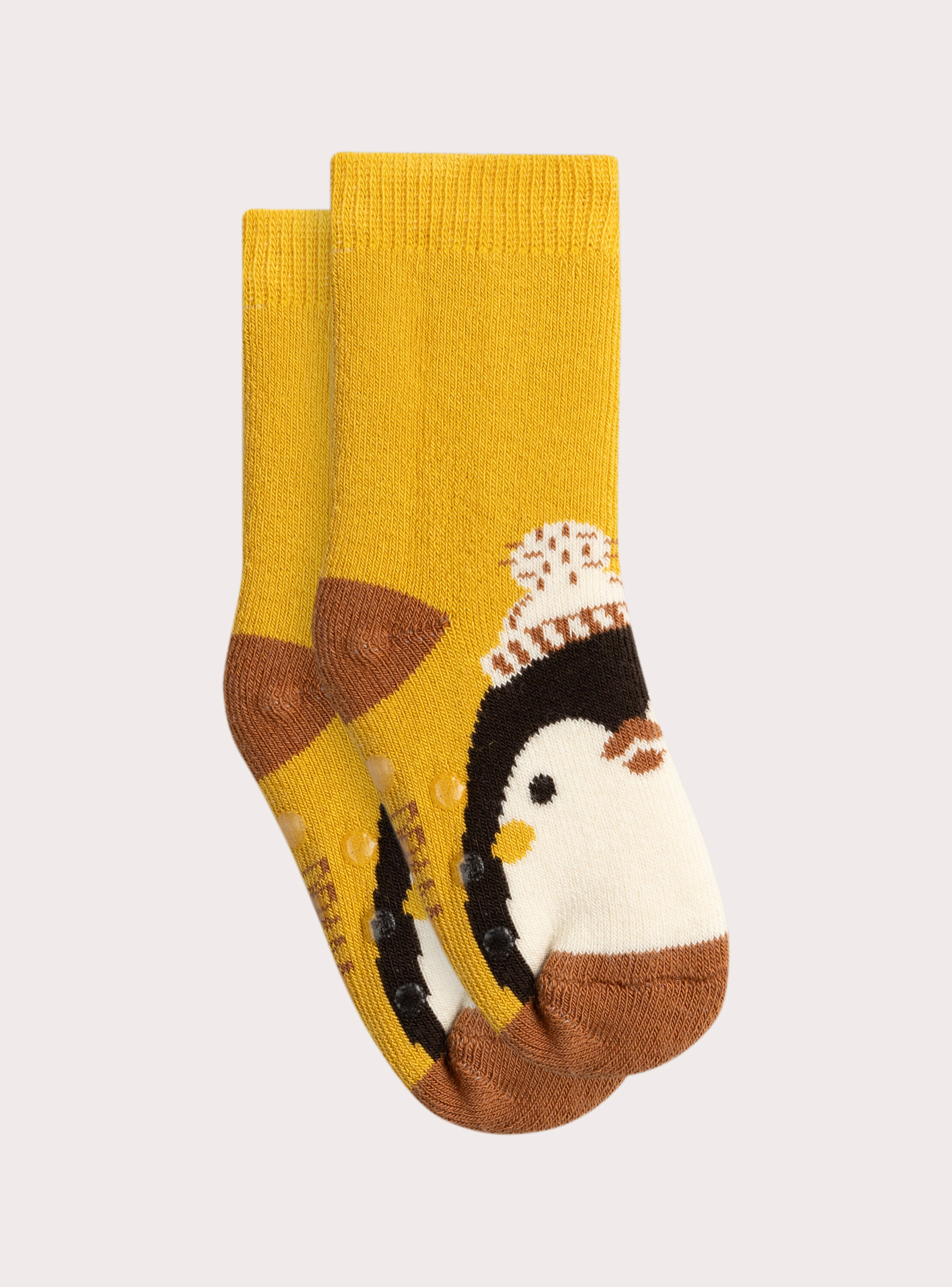 Apportez une touche ludique et colorée à vos journées avec ces chaussettes jaunes à motif pingouin. Conçues pour allier confort et sécurité, elles sont idéales pour les petits explorateurs en quête de style et de stabilité.