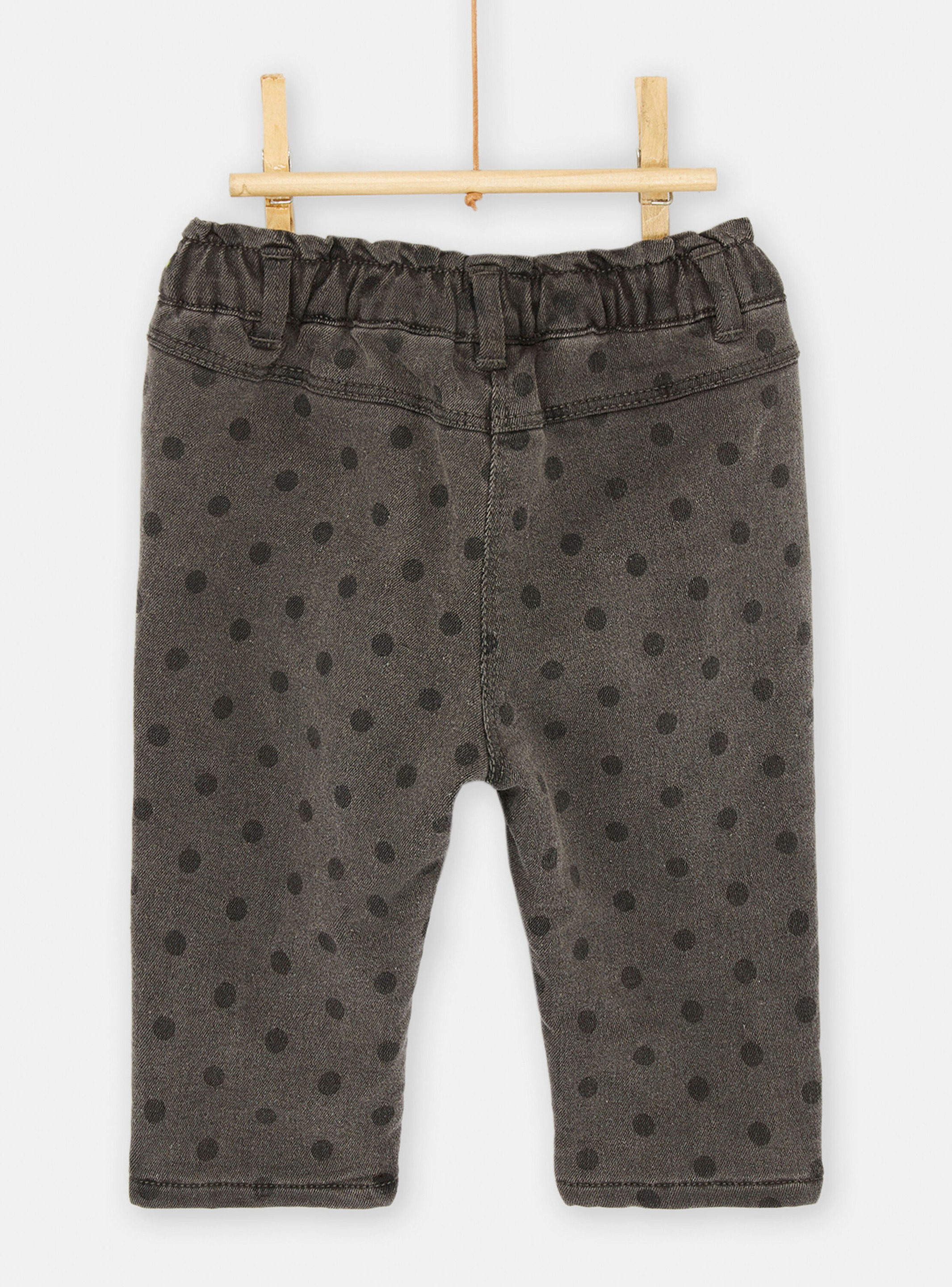 Fabriqué dans un tissu denim souple, ce pantalon présente une taille élastiquée pour un ajustement parfait. L’imprimé pois est intégré dans la matière, garantissant une tenue longue durée sans décoloration.