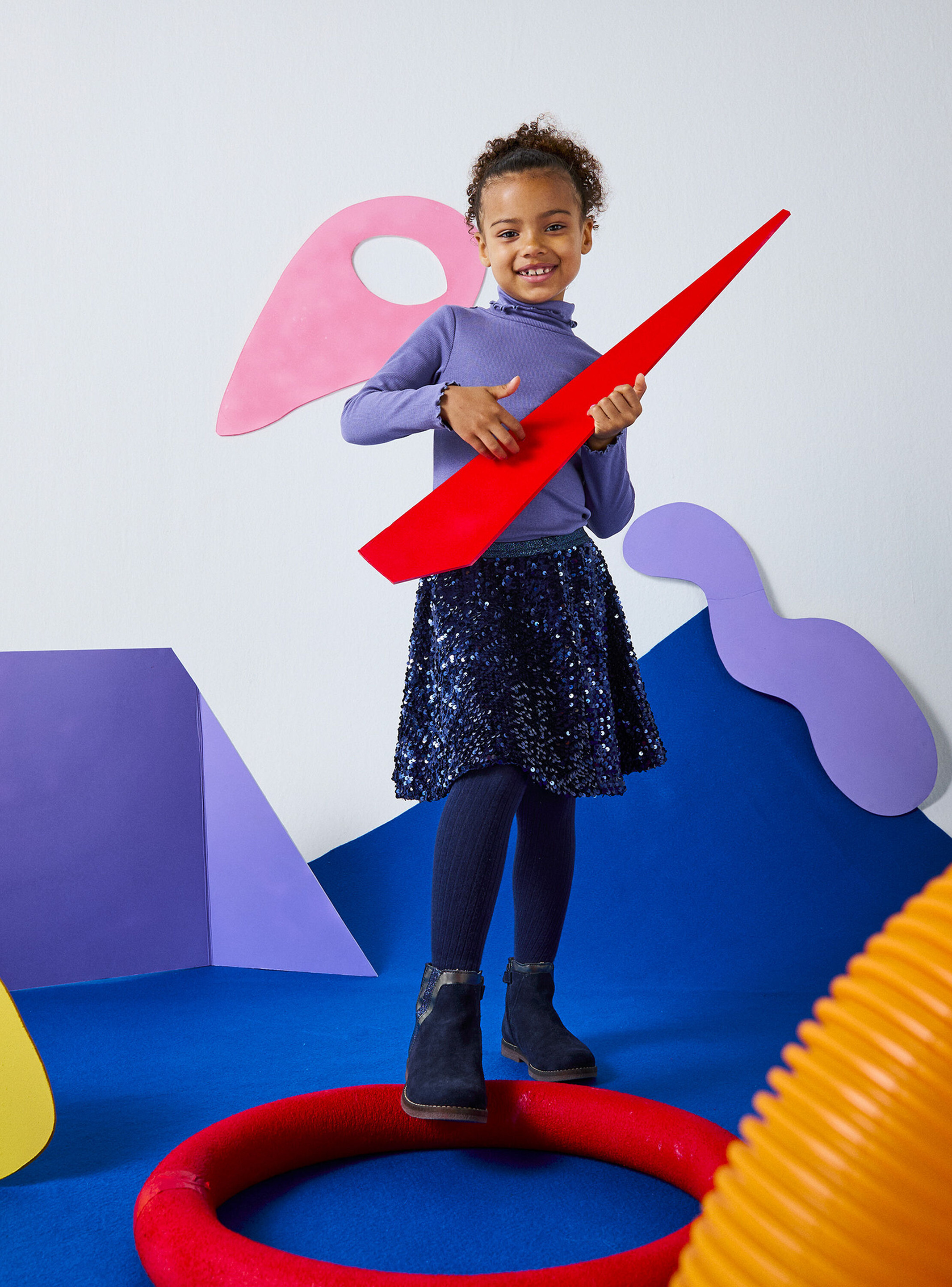 Cette jupe Du Pareil au Même séduit par sa couleur bleu profond et ses sequins délicatement posés, offrant un éclat subtil à chaque mouvement. Sa coupe fluide assure confort et liberté, parfaite pour accompagner les jeux comme les occasions spéciales. Facile à assortir, elle s’intègre naturellement dans une garde-robe enfantine moderne et stylée.