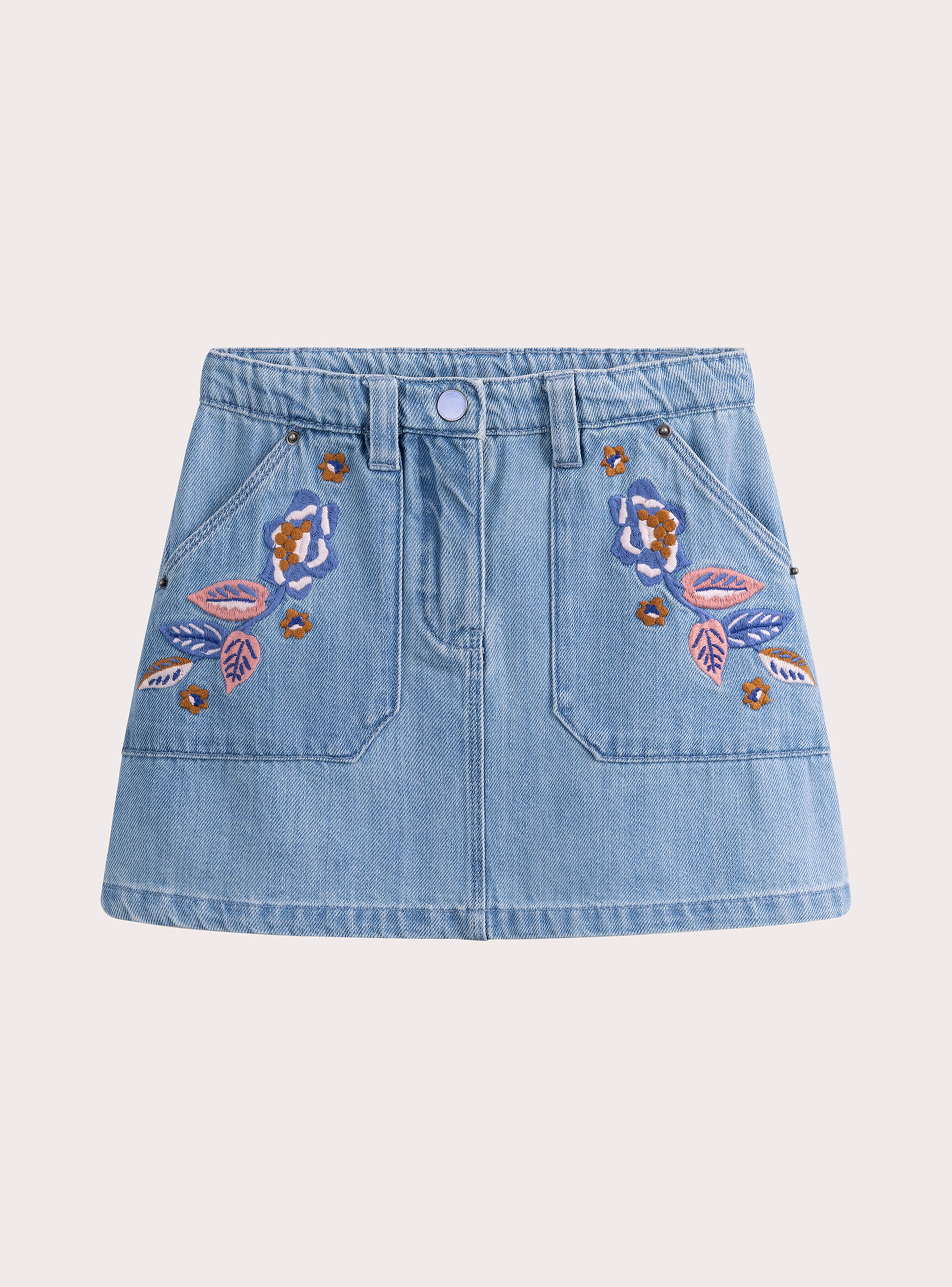 Fabriquée en denim bleu de qualité, la jupe présente des broderies fleuries soigneusement réalisées. Elle est disponible en plusieurs tailles adaptées aux filles, avec une taille élastique pour un ajustement parfait. Entretien facile en machine.