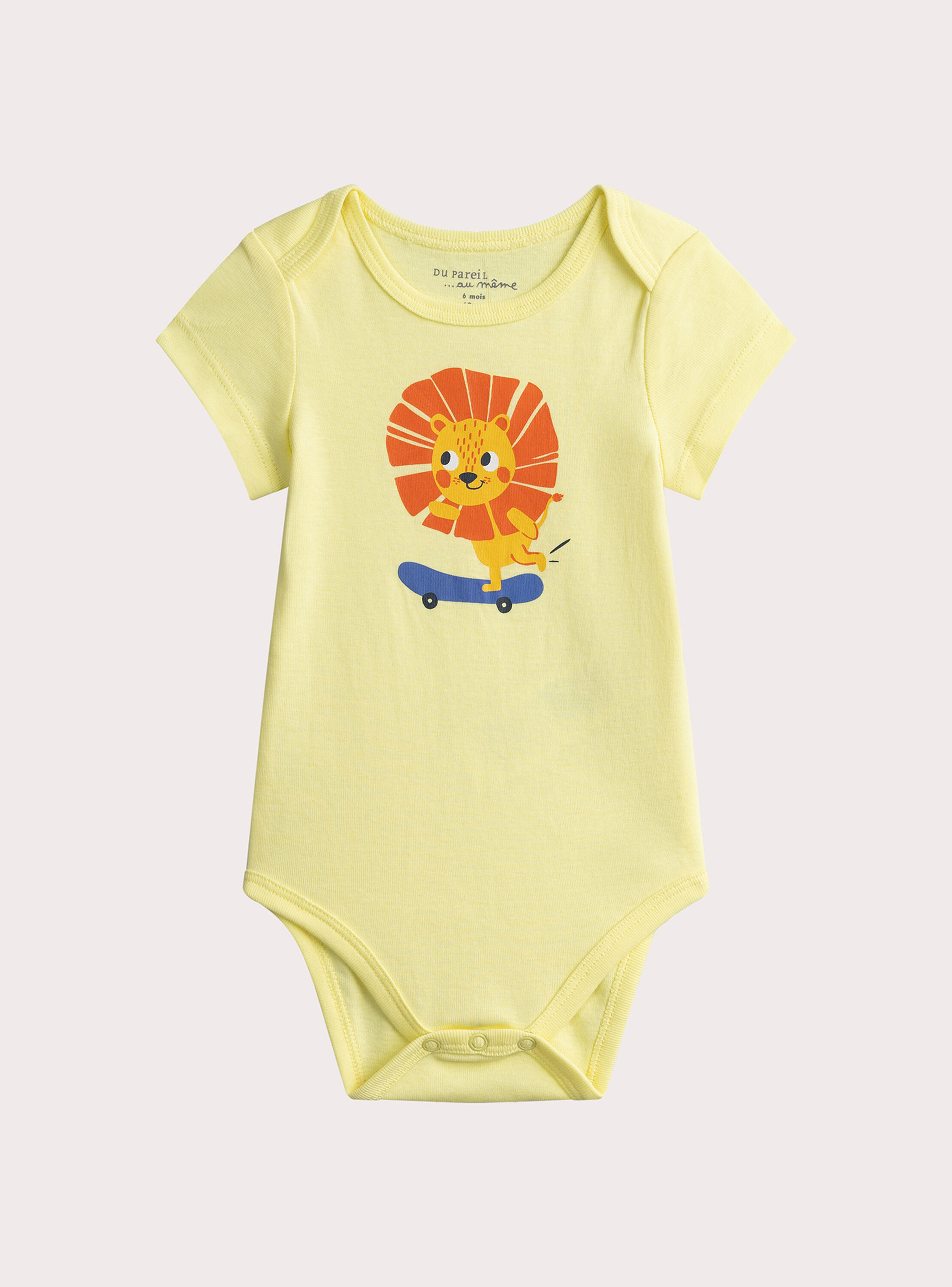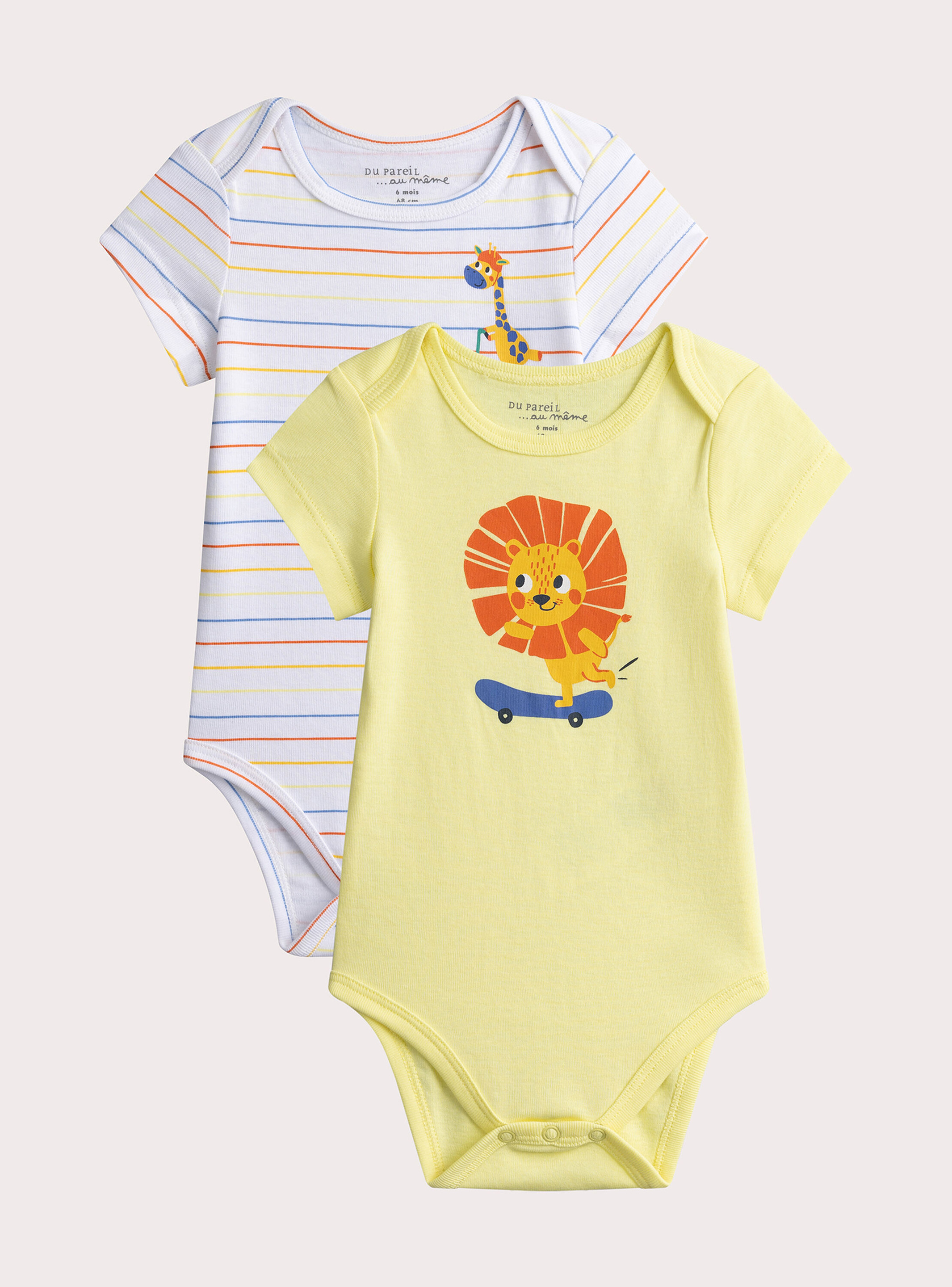 Lot de 2 bodies manches courtes avec motifs animaliers, marque Du Pareil au Même. Composition 100 % coton, fermeture par pressions à l’entrejambe. Lavable en machine à 30 degrés.