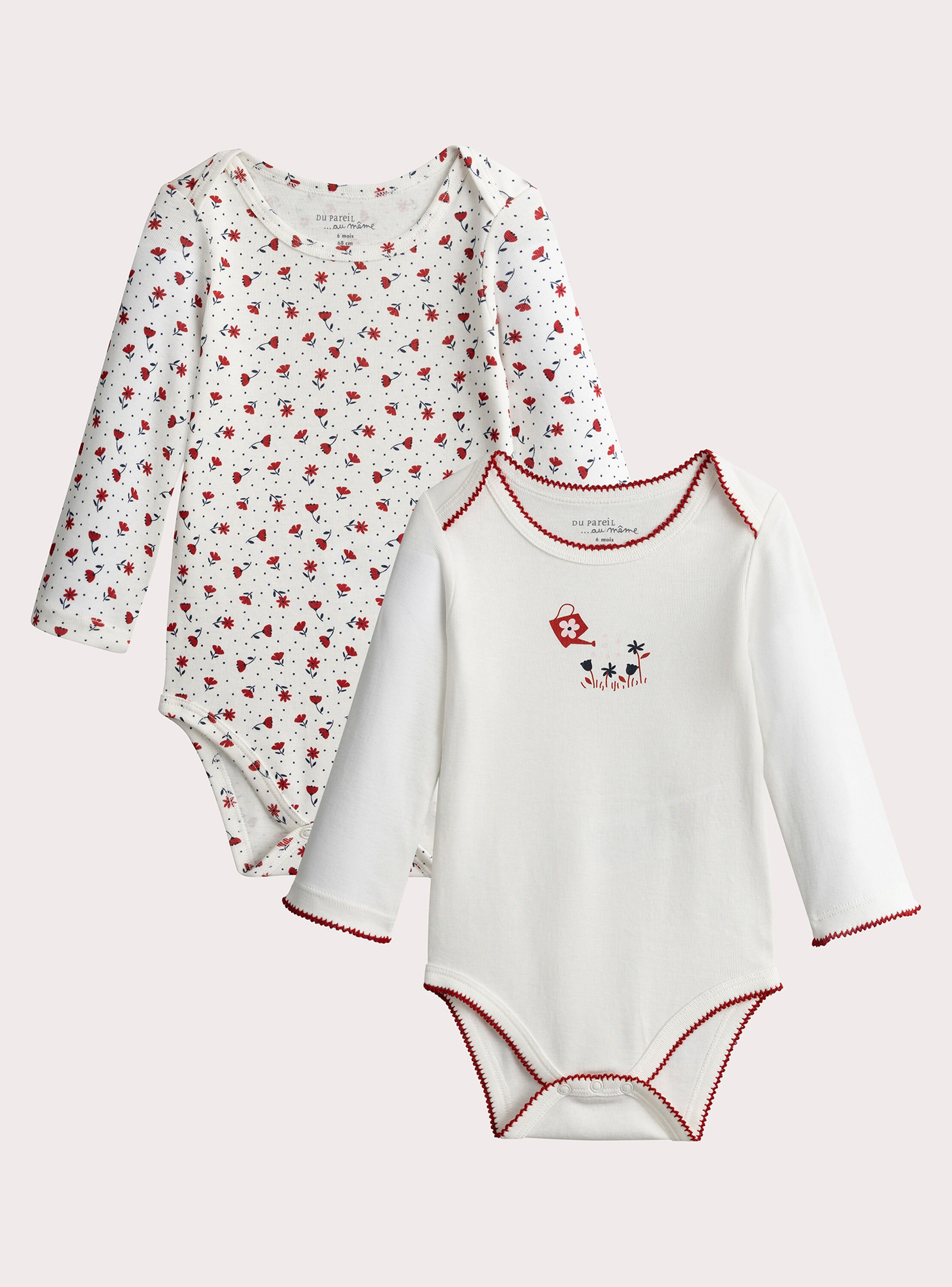 Lot de 2 bodies manches longues en coton doux, imprimé petites fleurs, marque Du Pareil au Même. Fermeture par boutons pression à l’entrejambe pour un habillage rapide. Lavable en machine, résistant aux lavages répétés.