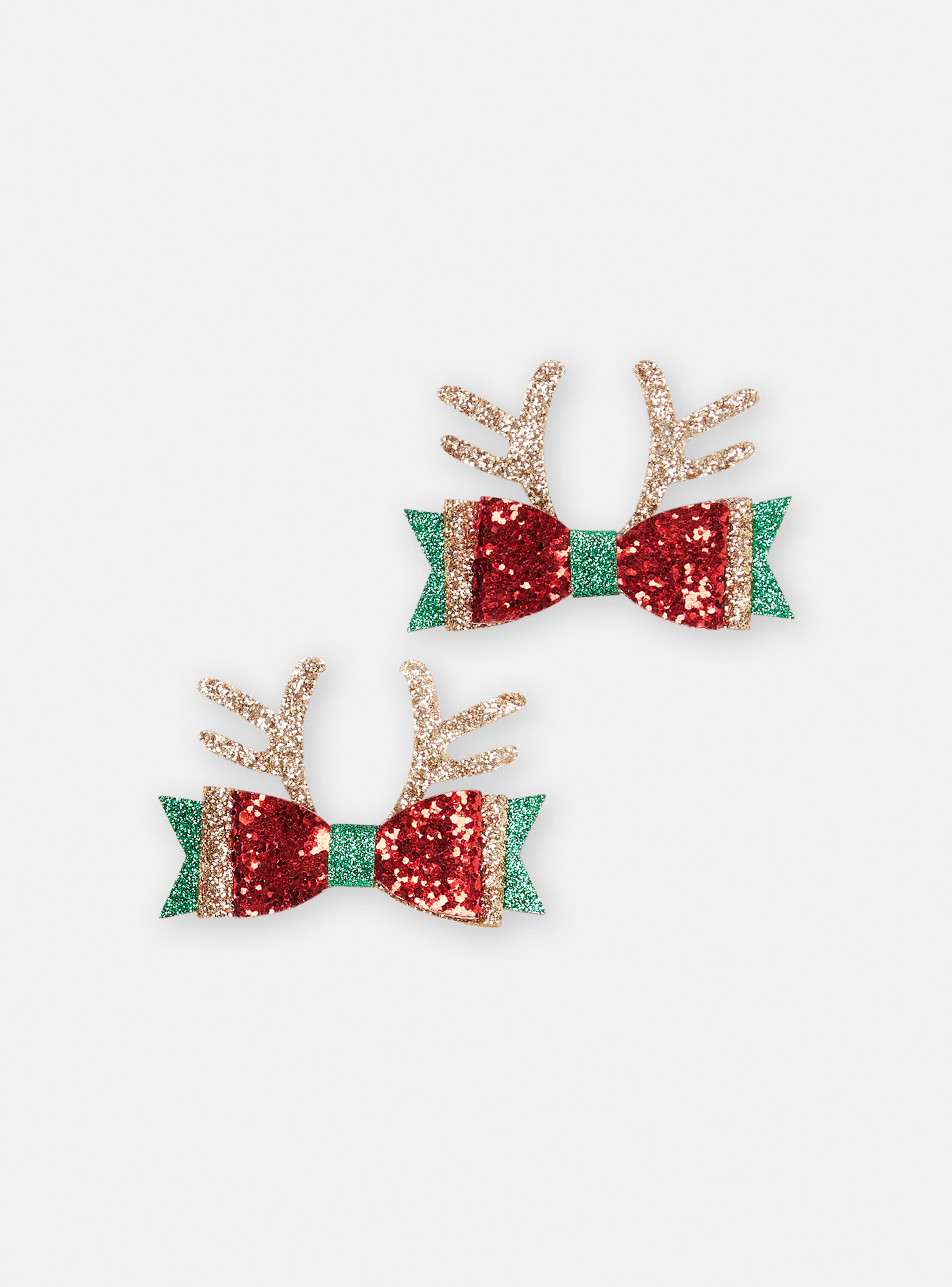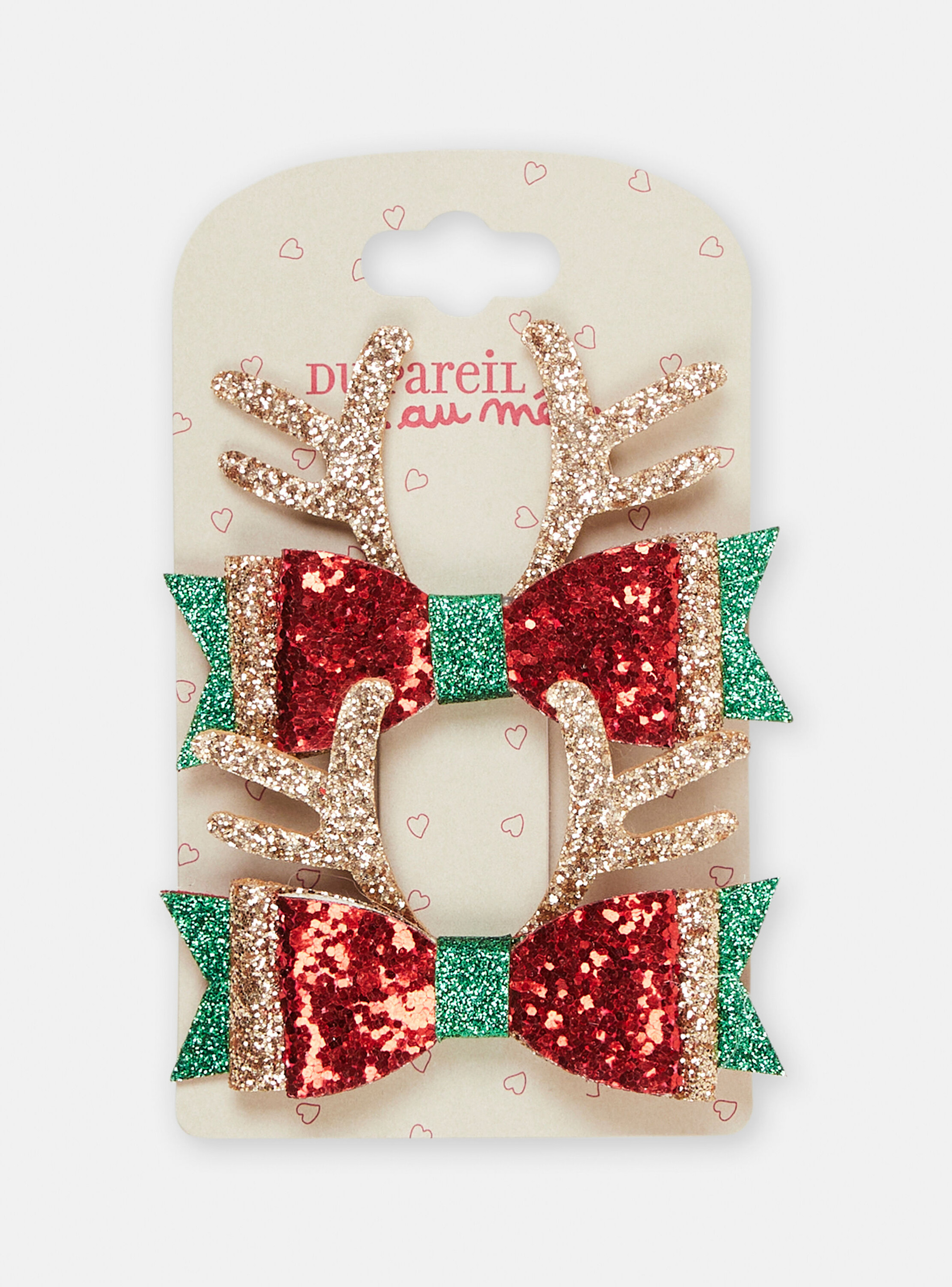 Lot de 2 pinces crocodiles décorées sur le thème de Noël. Marque : Du Pareil au Même. Accessoires adaptés aux cheveux fins à moyens, faciles à manipuler et à fixer.