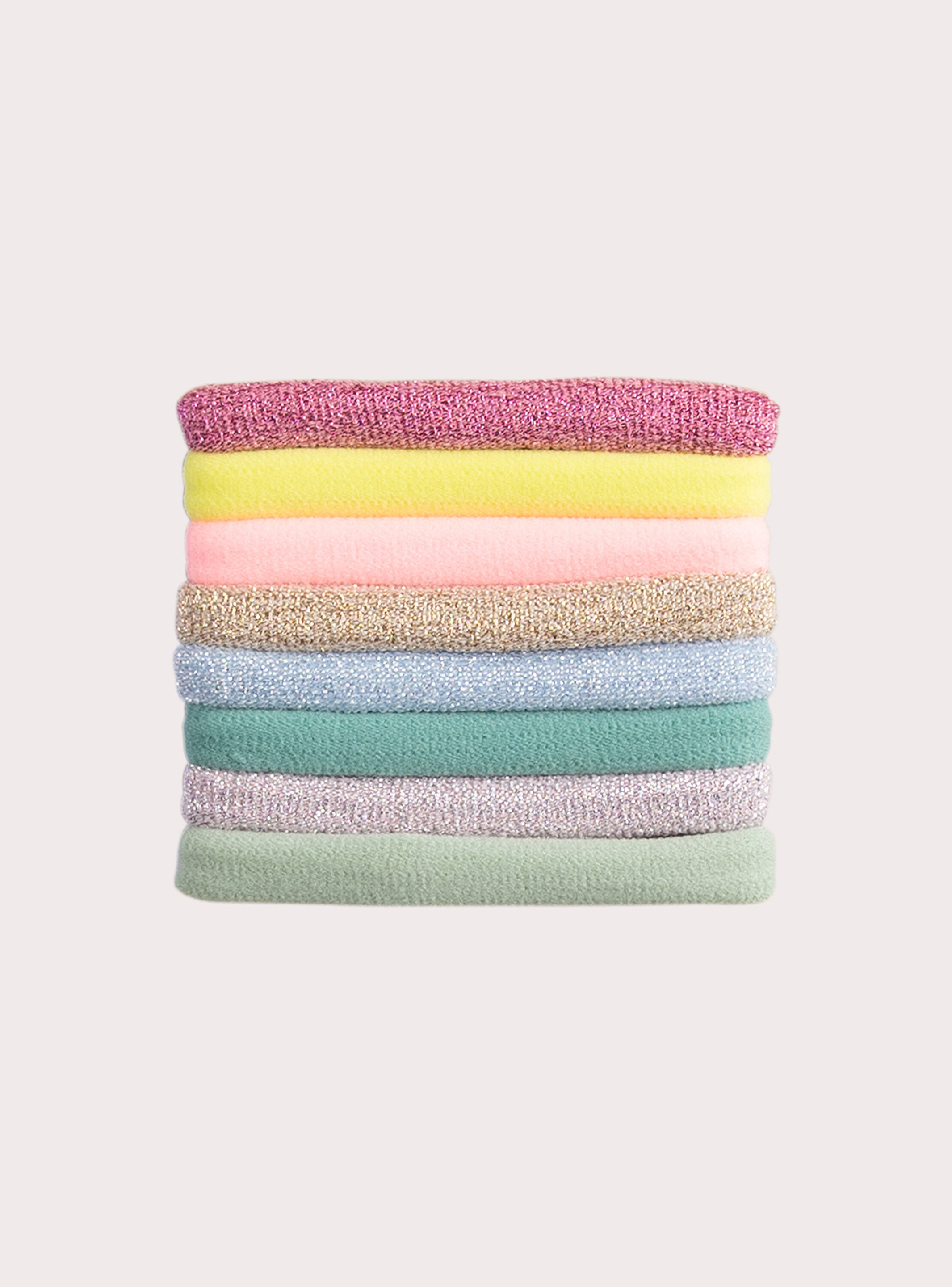 Lot composé de plusieurs élastiques en matériaux doux et résistants, déclinés en couleurs pastel assorties. Marque Du Pareil au Même, gage de qualité et de sécurité pour les enfants.