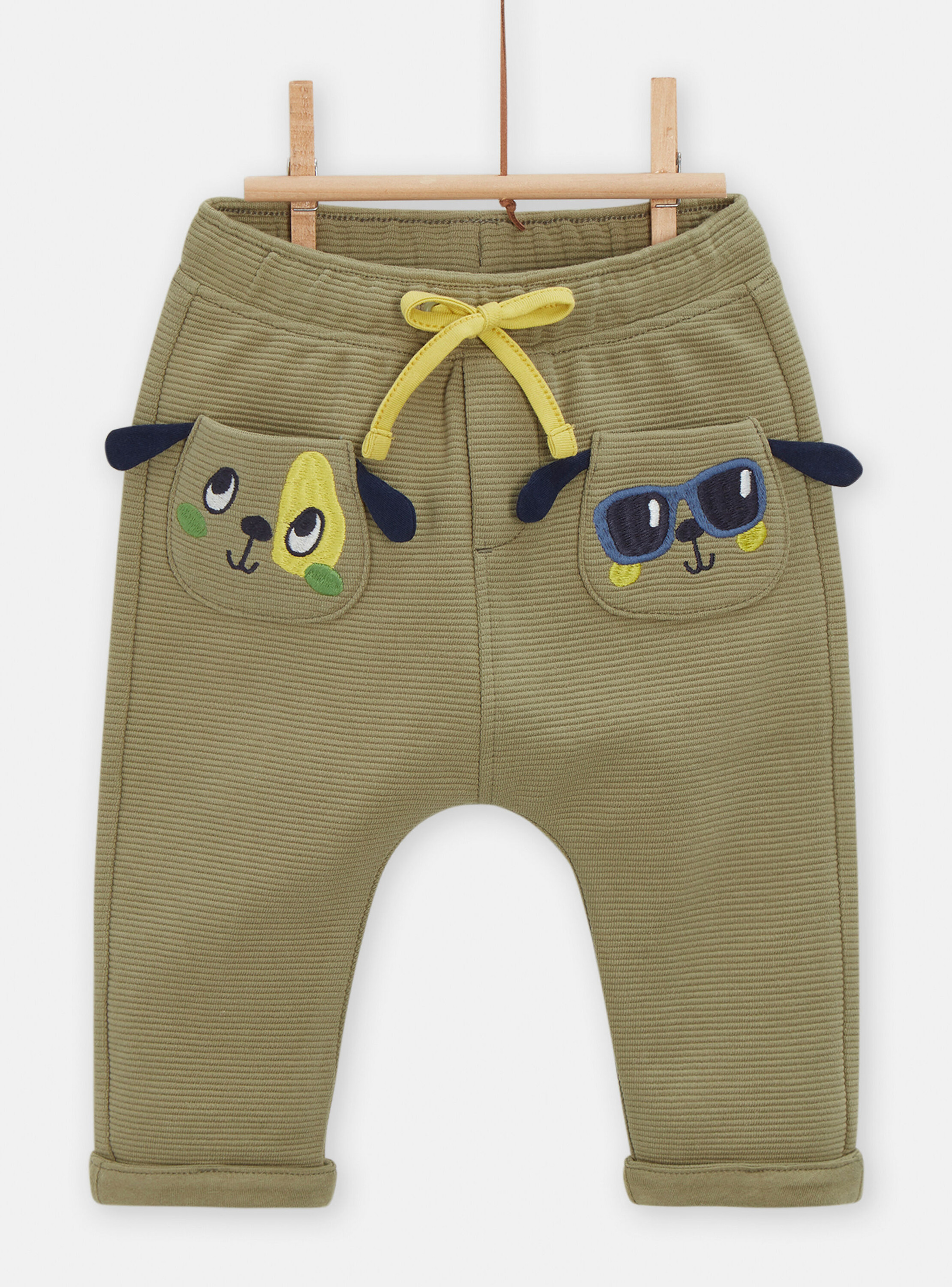 Pantalon en tissu doux et durable, coupe droite, taille élastiquée pour un ajustement parfait, motif chien imprimé sur la jambe, coloris kaki unisexe. Marque : Du Pareil au Même.