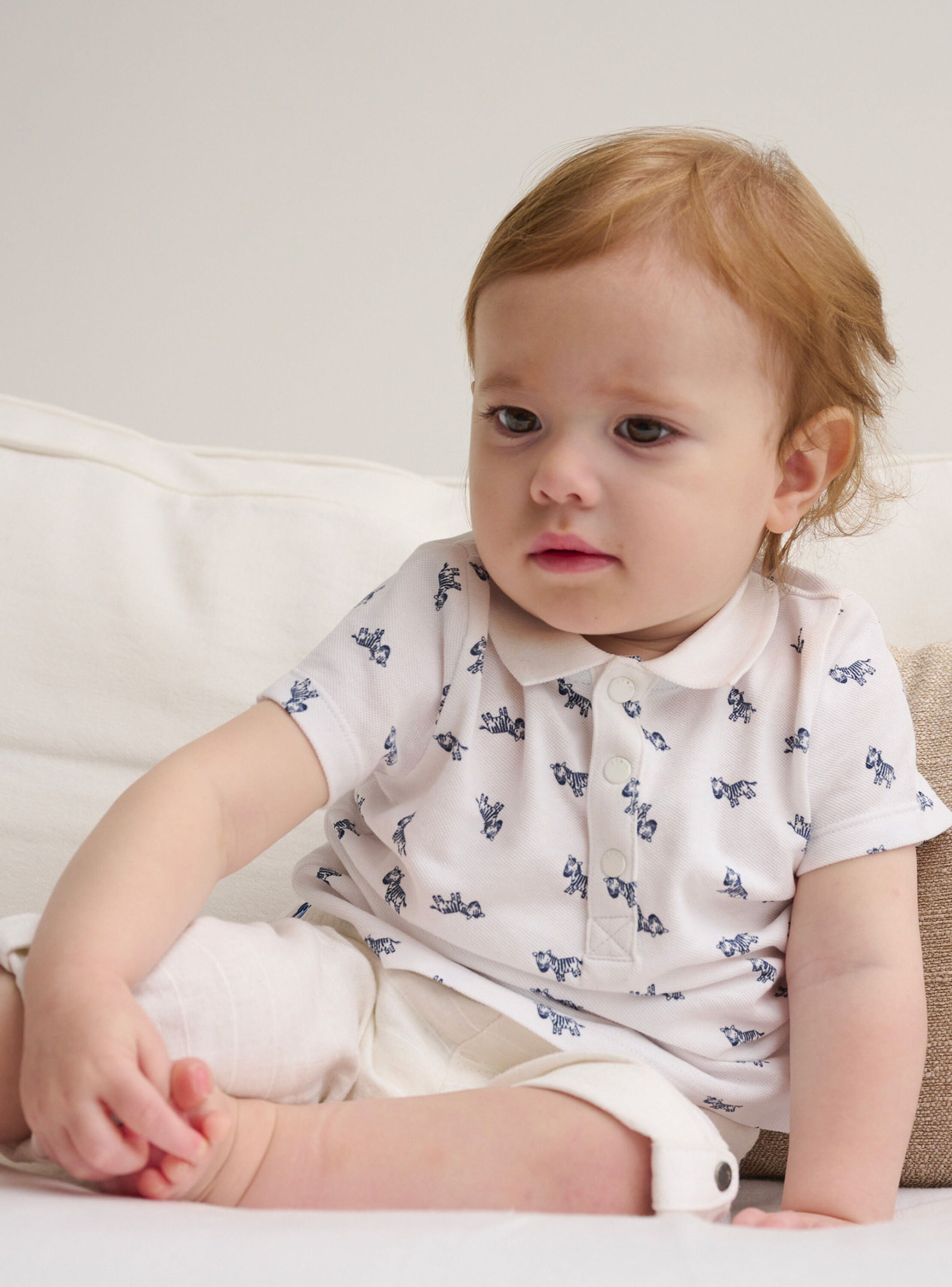 Disponible en plusieurs tailles, ce polo est fabriqué dans un tissu doux et léger, parfaitement adapté à la peau sensible des tout-petits. Il se ferme par une patte de boutonnage discrète pour un habillage rapide et confortable.
