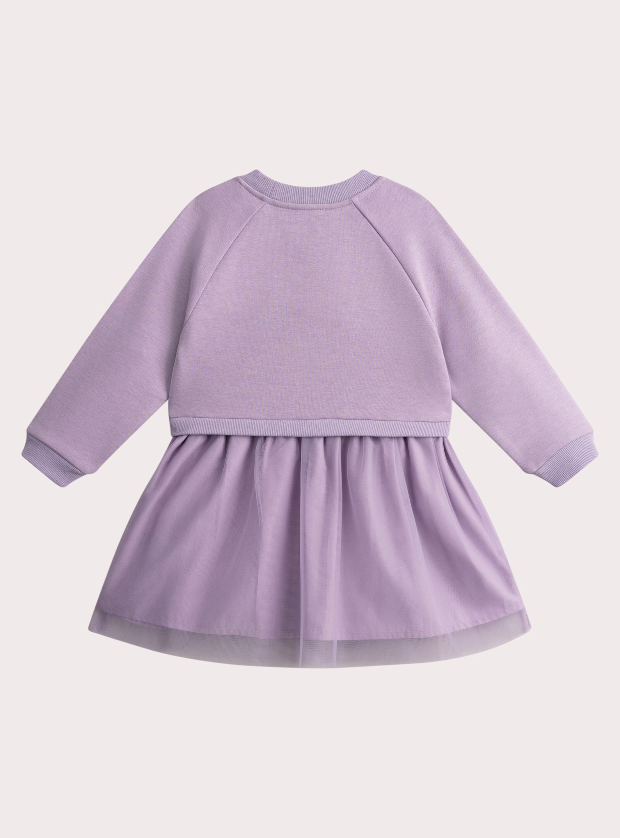 Robe sweat avec tulle à animation fleur violette pour fille, marque Du Pareil au Même. Matière principale douce et extensible, tulle décoratif en superposition. Coupe droite, manches longues, facile à enfiler.