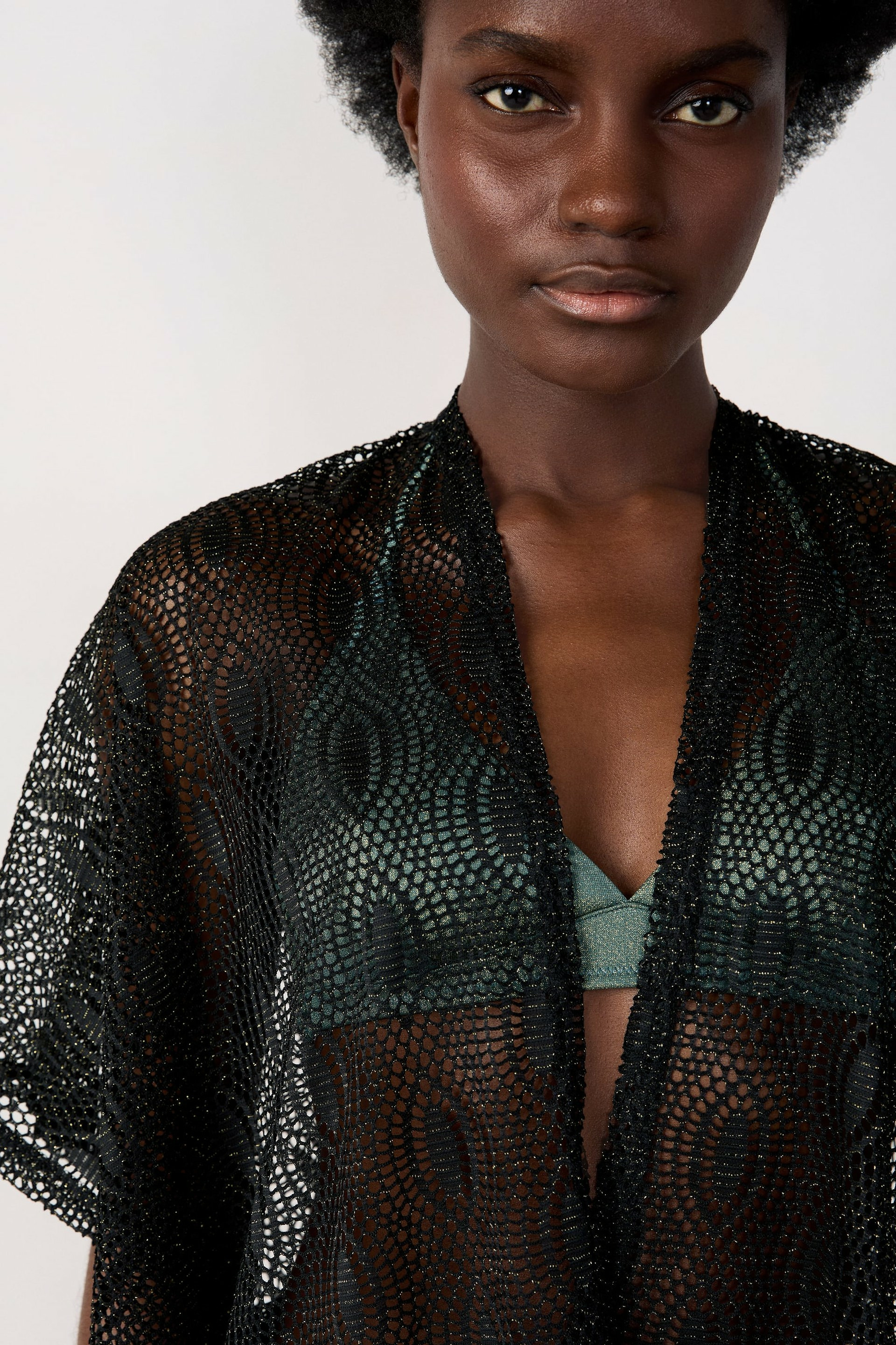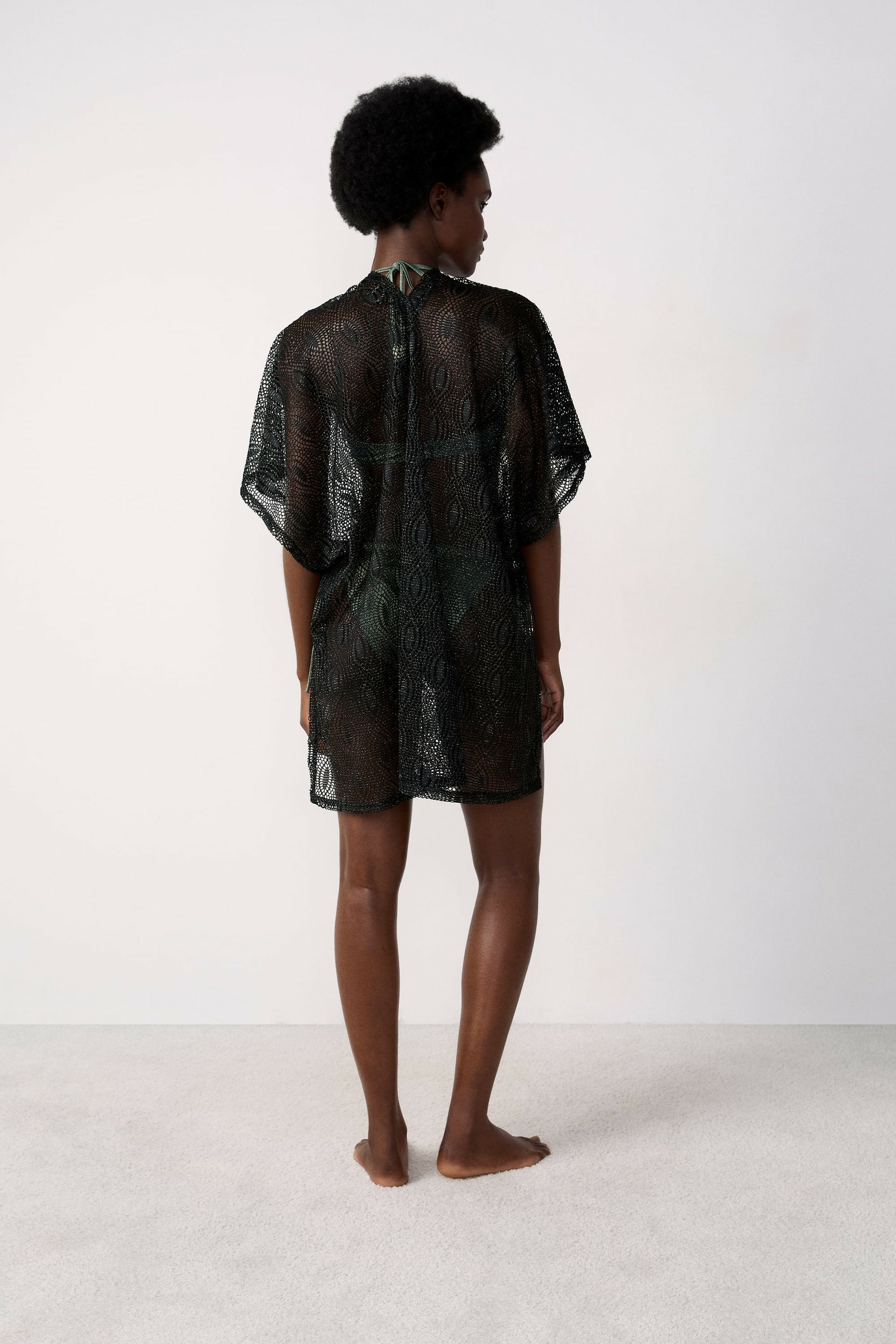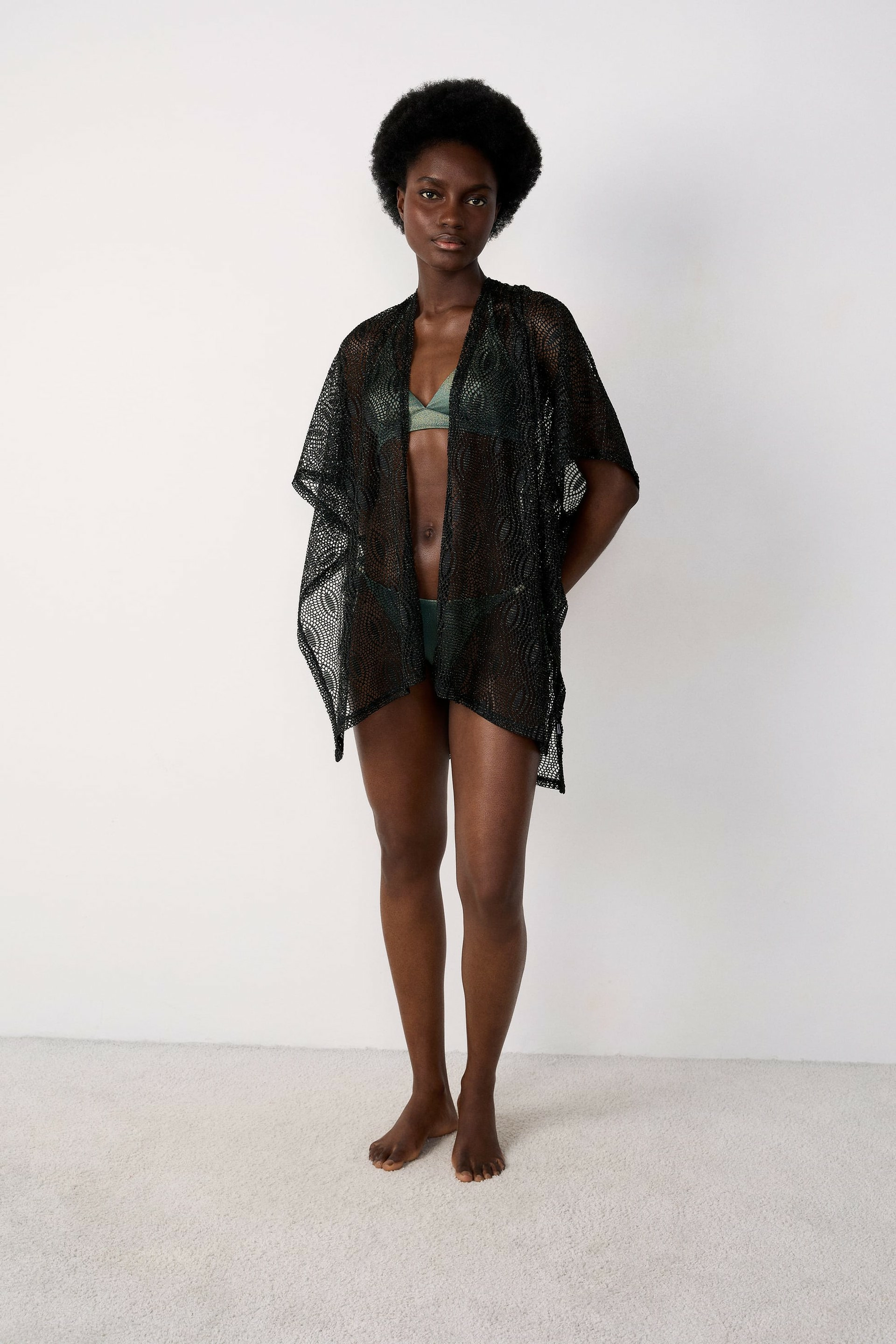 Confectionné dans un tissu délicatement ajouré, ce kimono joue avec la transparence pour révéler subtilement la peau tout en restant confortable. Sa coupe fluide et ses manches larges offrent une liberté de mouvement idéale, que ce soit pour une soirée ou une journée décontractée. Facile à associer, il apporte une dimension chic et moderne à vos looks.
